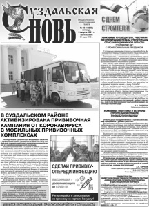 Газета основана 21 марта 1918 г. № 60 (12225) пятница, 6 августа 2021 г. Общественно политическая газета С огромным уважением отношусь к вашей работе. Вы – созидатели, творцы. Плодами вашего труда пользуются современники и многие поколения после вас. Строительство – локомотив и одновременно самый наглядный показатель развития страны и каждой её отдельной территории. Это видно на примере масштабных преобразований на нашей малой родине. Уже третий год в рамках реализации национальных проектов во Владимирской области возводятся новые жилые дома, школы, детские сады, больницы, спорткомплексы, культурные центры и многие другие социально значимые объекты. Мы уверенно держим темпы жилищного строительства. К концу 2021 года планируется ввести в эксплуатацию 680 тысяч квадратных метров жилья. В регион приходят инвестиции, растут существующие и открываются новые предприятия. И ваша работа – фундамент всех этих грандиозных процессов. Вы создаёте не только основу для повышения качества жизни людей, но и образ нашей малой родины. Видно, что многие из вас вкладывают в дело и знания, и душу. Спасибо! В этот праздничный день особые поздравления и слова признательности - ветеранам отрасли, внесшим неоценимый вклад в становление и развитие строительного комплекса области. Своим самоотверженным трудом вы заслужили почёт и уважение у земляков. Уважаемые строители! Пусть всё, что вы создаёте своими золотыми руками, стоит века и радует людей своей красотой и надёжностью! Желаю вам новых профессиональных достижений, доброго здоровья, счастья и благополучия! Ещё раз благодарю вас за плодотворный труд! В.В. СИПЯГИН, Губернатор области. УВАЖАЕМЫЕ РУКОВОДИТЕЛИ, РАБОТНИКИ ПРЕДПРИЯТИЙ И ВЕТЕРАНЫ СТРОИТЕЛЬНОЙ ОТРАСЛИ ВЛАДИМИРСКОЙ ОБЛАСТИ! ПОЗДРАВЛЯЮ ВАС С ПРОФЕССИОНАЛЬНЫМ ПРАЗДНИКОМ! От всей души поздравляем вас с профессиональным праздником – Днем строителя! Ваша профессия была и остаётся одной из самых востребованных и почитаемых, она требует немалых усилий, знаний, терпения и творческого подхода. Быть причастным к этой благородной профессии - большая честь и ответственность. Всё, что создано руками строителей, служит многим поколениям людей. Вы вносите свой весомый вклад в восстановление и сохранение неповторимого облика нашей Суздальской земли. Благодаря вашему созидательному труду Суздальский район с каждым годом становится более комфортным и благоустроенным. На протяжении ряда последних лет район занимает лидирующие позиции в области по вводу в действие жилья. Искренне благодарим вас за нелегкий труд, верность своему делу, за мастерство и высокий профессионализм. Уверены, что совместными усилиями мы сохраним и преумножим положительную динамику развития района. Особые слова благодарности выражаем ветеранам отрасли. Спасибо вам за верность профессии, за вашу плодотворную работу на благо Суздальского района. От всей души желаем всем, кто причастен к строительной отрасли, новаторских идей и смелых решений, воплощения планов и достижения профессиональных успехов, а также крепкого здоровья, семейного счастья, удачи и благополучия! А.П. САРАЕВ, Глава администрации Суздальского района. В.В. КИРИЛЛОВ, Глава Суздальского района. УВАЖАЕМЫЕ РАБОТНИКИ И ВЕТЕРАНЫ СТРОИТЕЛЬНОЙ ОТРАСЛИ СУЗДАЛЬСКОГО РАЙОНА! По поручению Губернатора Владимира Сипягина в 