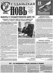 Газета основана 21 марта 1918 г. № 64 (12229) пятница, 20 августа 2021 г. Общественно политическая газета Уважаемые суздальцы! 17-19 сентября 2021 года пройдут выборы депутатов в Государственную Думу Федерального собрания Российской Федерации VIII созыва. Согласно законодательству о выборах, сотрудники ОМВД России по Суздальскому району в очередной раз заступят на охрану избирательных участков, а в дни (17, 18, 19 сентября) голосования (усиленными нарядами) будут контролировать на них законность и правопорядок. Исполняя свой служебный долг, личный состав отдела внутренних дел обеспечит нормальный ход избирательной кампании на всех 44 избирательных участках Суздальского района, а под охрану они будут взяты заблаговременно. В связи с этим напоминаю, что Кодекс Российской Федерации об административных правонарушениях (далее КоАП РФ) содержит ряд статей, предусматривающих ответственность за посягательства на общественные отношения, связанные с процессом выборов. В частности, наказывается: проведение предвыборной агитации, агитации по вопросам референдума вне агитационного периода и в местах, где ее проведение запрещено законодательством о выборах и референдумах (ст. 5.10 КоАП РФ); проведение предвыборной агитации, агитации по вопросам референдума лицами, которым участие в ее проведении запрещено федеральным законом (ст. 5.11 КоАП РФ); изготовление, распространение или размещение агитационных материалов с нарушением требований законодательства о выборах и референдумах (ст. 5.12 КоАП РФ); умышленное уничтожение или повреждение печатных материалов, относящихся к выборам, референдуму (ст. 5.14 КоАП РФ); привлечение к проведению предвыборной агитации лиц, которые не достигнут на день голосования возраста 18 лет; проведение агитации в формах и методами, которые запрещены федеральным законом. Уместно напомнить, что запрещёнными формами и методами агитации считаются: изготовление, распространение или размещение агитационных материалов с нарушением требований законодательства о выборах и референдумах; умышленное уничтожение или повреждение печатных материалов, относящихся к выборам, референдуму; подкуп избирателей, участников референдума либо осуществление в период избирательной кампании, кампании референдума благотворительной деятельности с нарушением законодательства о выборах и референдумах; нарушение запрета на проведение в период избирательной кампании, кампании референдума лотерей и других, основанных на риске игр, связанных с выборами и референдумом; производство и распространение экстремистских материалов. Помимо наказания за нарушение действующего выборного законодательства, установленного КоАП РФ, граждане так же могут быть привлечены ОБРАЩЕНИЕ НАЧАЛЬНИКА ОМВД РОССИИ ПО СУЗДАЛЬСКОМУ РАЙОНУ Д.А. ИЛЬИНА К ЖИТЕЛЯМ СУЗДАЛЬСКОЙ ЗЕМЛИ ВЫБОРЫ В ГОСУДАРСТВЕННУЮ ДУМУ РФ к ответственности и за нарушения общественного порядка на избирательных участках и непосредственно около них. К таким нарушениям относятся: появление в пьяном виде, различные хулиганские действия, нецензурная брань. Помните, что указанные действия, идущие в разрез с требованиями законодательства, влекут наложение административного штрафа, а так же административный арест. Сегодня все мы живём в сложное, напряжённое время. О террористических актах и их попытках мн