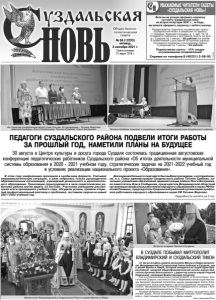 Газета основана 21 марта 1918 г. № 68 (12233) пятница, 3 сентября 2021 г. Общественно политическая газета В этом году конференция проходила в необычном формате. Учитывая эпидемиологическую ситуацию, в зале собрались только руководители образовательных организаций, учреждений дошкольного и дополнительного образования. Трансляцию происходящего в зале педагогические работники района могли видеть на YouTube. Участники совещания рассмотрели итоги прошедшего учебного года, обсудили успехи, провели открытый профессиональный разговор о проблемах, поставили задачи на новый 2021-2022 учебный год. Для ведения большого педсовета был выбран президиум, в который вошли: и.о. Главы администрации Суздальского района Татьяна Срибная, начальник управления образования администрации района Ольга Богданова, ее заместитель Ольга Слабышева, председатель Владимирской областной организации профсоюза работников народного образования и науки РФ Николай Синицын, председатель Суздальской районной организации профсоюза работников народного образования и науки РФ Татьяна Фирсова. ПЕДАГОГИ СУЗДАЛЬСКОГО РАЙОНА ПОДВЕЛИ ИТОГИ РАБОТЫ ЗА ПРОШЛЫЙ ГОД, НАМЕТИЛИ ПЛАНЫ НА БУДУЩЕЕ 30 августа в Центре культуры и досуга города Суздаля состоялась традиционная августовская конференция педагогических работников Суздальского района «Об итогах деятельности муниципальной системы образования в 2020 - 2021 учебном году, стратегических задачах на 2021-2022 учебный год в условиях реализации национального проекта «Образование». 31 августа в День памяти мучеников Фрола и Лавра митрополит Владимирский и Суздальский Тихон побывал в Суздале, где в храме Фрола и Лавра, который находится на территории Православной средней общеобразовательной школы имени Святителя Арсения Элассонского ( директор школы иерей Георгий Кравченко) совершил Божественную литургию. Ему сослужили священники города Суздаля ,в числе которых благочинный Суздаля, настоятель Спасо-Евфимиева монастыря иеромонах Арсений, духовный попечитель школы архимандрит Свято-Александровского монастыря Авель и др.Богослужебные песнопения исполнил Архиерейский хор Успенского кафедрального собора г. Владимира под управлением регента Т.Оганян. В храме молились учащиеся и педагоги школы, их родители, прихожане храма. После окончания Литургии владыка Тихон поздравил всех с престольным праздником, с Днем знаний. http://www.eparh33.ru В СУЗДАЛЕ ПОБЫВАЛ МИТРОПОЛИТ ВЛАДИМИРСКИЙ И СУЗДАЛЬСКИЙ ТИХОН На открытии конференции звучит гимн России. В президиуме - Татьяна Фирсова, Николай Синицын, Ольга Слабышева, Татьяна Срибная, Ольга Богданова. Татьяна Срибная знакомит с социально-экономическим развитием Суздальского района. Подробности читайте на 3 стр. Встреча владыки Тихона в Суздале. Митрополит Владимирский и Суздальский Тихон в храме Фрола и Лавра. Справки по телефону 8 (49231) 2-08-95 Реклама УВАЖАЕМЫЕ ЧИТАТЕЛИ ГАЗЕТЫ «СУЗДАЛЬСКАЯ НОВЬ»! Продолжается подписка на районную газету «Суздальская новь» в редакции по адресу: г. Суздаль, Красная площадь, д. 1, каб. 12,18. Стоимость подписки с доставкой газеты на дом в г. Суздале на 1 месяц – 60 рублей (не менее 5 экземпляров с доставкой по одному адресу). Стоимость подписки с получением газеты в редакции на 1 месяц – 55 рублей. Подписчикам газеты - 10% скидка на размещение поздравлений! Если вы не успели оформить 