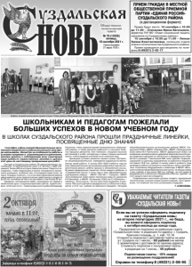 Газета основана 21 марта 1918 г. № 70 (12235) пятница, 10 сентября 2021 г. Общественно политическая газета ПРИЕМ ГРАЖДАН В МЕСТНОЙ ОБЩЕСТВЕННОЙ ПРИЕМНОЙ ПАРТИИ «ЕДИНАЯ РОССИЯ» СУЗДАЛЬСКОГО РАЙОНА (в дистанционном формате) Прием будут вести: 14 сентября с 10.00 до 11.00 – Степанова Ирина Евгеньевна, директор ГКУ ВО «Отдел социальной защиты населения по Суздальскому району»; 15 сентября с 10.00 до 11.00 – Липкан Галина Константиновна, начальник отдела опеки и попечительства Суздальского района. Прием проводится дистанционно по телефону 8 (49231) 2-05-17. 1сентября, в День знаний образовательные организации Суздальского района распахнули свои двери школьникам. Несмотря на особенности работы в условиях пандемии и сохраняющиеся ограничения, школам удалось с соблюдением всех санитарных норм провести торжественные линейки и сделать этот день по-настоящему праздничным для ребят. Сегодня в Суздальском районе 38 образовательных организаций: 15 муниципальных школ и 2 частных с 4325 учащимися, более 400 из которых первоклассники. Педагоги постарались, чтобы первый день в школе понравился и запомнился учащимся, особенно тем, кто впервые переступил ее порог. Отрадно отметить, что в системе образования района увеличивается доля педагогических работников в возрасте до 35 лет, основная же часть из них имеют стаж более 20 лет. Нарядных, волнующихся ребят, пришедших на первый в своей жизни урок с пышными букетами цветов, приветствовали почетные гости – Глава Суздальского района Владимир Кириллов, главы администраций муниципальных образований района, а также депутаты районного и сельских Советов народных депутатов. Они пожелали учащимся высоких достижений в учебе, интересных и ярких страниц школьной жизни, поблагодарили учителей за их нелегкий труд. Нынешние условия развития нашей страны заставляют общеобразовательные учреждения кардинально менять вектор своей работы. К началу 2021-2022 учебного года во всех образовательных организациях района был сделан косметический ремонт, ребята пришли в обновленные классы. В рамках федеральных проектов «Успех каждого ребенка» и «Современная школа» в этом году в трех образовательных учреждениях района - МБОУ «СШ №1 г. Суздаля», МБОУ «Боголюбовская СОШ имени чемпионки мира по шахматам Е.И.Быковой» и МБОУ «Сновицкая СОШ им С.Н.Белкина» - появятся «Точки роста». На эти цели было выделено 4 миллиона 706 тысяч рублей из федерального и областного бюджетов и 47,6 тыс. рублей из районного бюджета. Четырем общеобразовательным организациям района( МБОУ «Сокольская СОШ», МБОУ «Садовая СШ», МБОУ «Новосельская СОШ имени В.П.Пантыкина», МБОУ «Добрынская ООШ») на внедрение целевой модели цифровой образовательной среды выделена субсидия из областного и федерального бюджетов в размере 7 миллионов 598 тысяч рублей. Софинансирование по данному направлению из районного бюджета составило 76,8 тыс. рублей. К началу нового учебного года проведены работы по ремонту спортивного зала и приобретено спортивное оборудование и инвентарь в МБОУ «Весьская основная общеобразовательная школа» на общую сумму 1 млн. рублей, в том числе: 800 тыс. рублей - за счет средств федерального и областного бюджетов и 200 тыс. рублей - за счет средств местного бюджета. Современные школьники должны владеть передовыми технологиями, получать новые знания и умения, быть здоровыми, что по