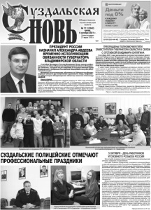 Газета основана 21 марта 1918 г. № 77 (12242) среда, 6 октября 2021 г. Общественно политическая газета Реклама 12+ СУЗДАЛЬСКИЕ ПОЛИЦЕЙСКИЕ ОТМЕЧАЮТ ПРОФЕССИОНАЛЬНЫЕ ПРАЗДНИКИ Подполковник внутренней службы Дмитрий Киреев. А.В. Степанова и Е.Л. Сидорова - сотрудницы штаба. 5 ОКТЯБРЯ - ДЕНЬ РАБОТНИКОВ УГОЛОВНОГО РОЗЫСКА РОССИИ Эта служба за время своего существования несколько раз меняла название и подчинение. Сегодня Главное управление уголовного розыска Министерства внутренних дел Российской Федерации (ГУУР МВД России) является самостоятельным структурным подразделением центрального аппарата МВД, обеспечивающим и осуществляющим в пределах своей компетенции функции Министерства по выработке и реализации государственной политики и нормативно-правовому регулированию в области выявления, предупреждения, пресечения и раскрытия преступлений общеуголовной направленности, розыска лиц, организации и осуществления оперативно-розыскной деятельности. В настоящее время отделение уголовного розыска (ОУР) в ОМВД России по Суздальскому району является одним из основных и крупных (в штате 14 сотрудников) подразделений. В нём служат опытные полицейские, прошедшие хорошую школу в иных подразделениях ОМВД. Наши сыщики занимаются раскрытием самых серьёзных преступлений: краж, мошенничеств, хищений, преступлений против личности (убийства, изнасилования, похищения людей, причинения вреда здоровью…). В ОУР у каждого сотрудника имеется территориальная зона ответственности и закреплённое направление деятельности. Без преувеличения можно сказать, что сотрудники уголовного розыска – это элита полиции. В этом подразделении служат преданные делу люди, умеющие работать в коллективе и всегда готовые подставить плечо товарищу. Оттого-то в ОУР свято чтут традиции, преемственность и своих ветеранов. Продолжение на 2 стр. Суздальские сотрудники ОУР, 2004 год. Нынешний коллектив подразделения на очередной планёрке (в служебной форме С.Н. Трифонов). ПРЕЗИДЕНТ РОССИИ НАЗНАЧИЛ АЛЕКСАНДРА АВДЕЕВА ВРЕМЕННО ИСПОЛНЯЮЩИМ ОБЯЗАННОСТИ ГУБЕРНАТОРА ВЛАДИМИРСКОЙ ОБЛАСТИ 4 октября Президент России Владимир Путин принял добровольную отставку Губернатора Владимирской области Владимира Сипягина, который после избрания в Государственную Думу Федерального Собрания Российской Федерации получил депутатский мандат. Временно исполняющим обязанности Губернатора Владимирской области (до вступления в должность лица, избранного Губернатором Владимирской области) назначен Александр АВДЕЕВ. Наша справка Александр Александрович Авдеев родился в 1975 году в Калуге. Закончил Калужский филиал МГТУ им. Н.Э.Баумана, проходил обучение по Президентской программе подготовки управленческих кадров. С 2010 года работал главой администрации города Обнинска, с 2015 года занимал должность заместителя Губернатора Калужской области. В 2016 году был избран в Государственную Думу VII созыва по одномандатному избирательному округу, представляя Партию «ЕДИНАЯ РОССИЯ». ПРЕКРАЩЕНЫ ПОЛНОМОЧИЯ ПЯТИ ЗАМЕСТИТЕЛЕЙ ГУБЕРНАТОРА ОБЛАСТИ В СВЯЗИ С ОТСТАВКОЙ ВЛАДИМИРА СИПЯГИНА 4 октября 2021 года прекращены полномочия первых заместителей Губернатора Владимирской области Аркадия БоцанХарченко и Александра Ремиги, временно исполняющих обязанности заместителей Губернатора Григория Вишневского и Герм