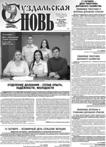 Газета основана 21 марта 1918 г. № 80 (12245) пятница, 15 октября 2021 г. Общественно политическая газета 12+ От имени администрации и Совета народных депутатов Суздальского района примите самые теплые и искренние поздравления с Днем работников дорожного хозяйства! В этот день мы отдаем дань уважения мастерству тех, кто ремонтирует и поддерживает в достойном состоянии дороги, круглый год обеспечивает содержание и эксплуатацию сложного дорожного хозяйства, а значит – надежное и безопасное автомобильное сообщение между населенными пунктами нашего района. Каждый год вы вносите огромный вклад в развитие дорожной инфраструктуры Суздальского района. С вашей помощью реализуются такие проекты, как «Безопасные и качественные дороги», «Комфортная городская среда». Благодарим вас за профессионализм и добросовестный труд. Особую благодарность выражаем ветеранам отрасли, посвятившим свою жизнь трудному, благородному и нужному делу. Желаем вам крепкого здоровья, сил и семейного благополучия. Пусть успех и удача будут постоянными спутниками в вашей работе. Стабильных вам объемов работ, четкого и своевременного финансирования, новых качественных километров дорог! А.П. САРАЕВ, Глава администрации Суздальского района. В.В. КИРИЛЛОВ, Глава Суздальского района. Дорогие женщины, проживающие в сельской местности! От всей души поздравляем вас с Всемирным днём сельских женщин! Этот замечательный осенний праздник олицетворяет уважение к прекрасной половине человечества, живущей в сельской местности и преклонение перед её заслугами в разных сферах деятельности на селе. Сегодня женщине села по плечу любая роль – она организует свое дело, активно участвует в общественной жизни района, занимает руководящие посты. Но кем бы не работали женщины села, они всегда помнят о своем главном предназначении – быть хранительницей домашнего очага, беречь и передавать свои традиции, нравственные устои – все, на чем держится не только русское село, но и сама Россия. Дорогие женщины! Спасибо за вашу житейскую мудрость и доброту, высокий профессионализм и трудолюбие. Сердечно желаем здоровья и добра, радости и простого женского счастья, удачи и благополучия. И пусть в вашем доме всегда будут взаимопонимание и уважение, вера, надежда, любовь! Примите поздравления с вашим профессиональным праздником – Днём работников дорожного хозяйства! Состояние дорог – одно из важнейших условий жизнеобеспечения, развития экономики и инфраструктуры любой территории. От того, как дорожники выполняют свою работу, зависит безопасность движения, оперативность грузовых и пассажирских перевозок, связь между регионами страны, динамичное развитие всех отраслей производства и общественной инфраструктуры. В 2019 году Владимирская область стала участником национального проекта «Безопасные качественные дороги». В текущем году дорожные работы в рамках нацпроекта охватывают 54 объекта дорожной сети региона. Планируется привести в нормативное состояние более 100 км региональных, межмуниципальных, местных автодорог и городских улиц. При этом применяются новые материалы и технологические решения, показавшие себя с лучшей стороны. Уверен, что работники дорожной отрасли будут и дальше верны своему делу и внесут достойный вклад в развитие сети автомобильных дорог на Владимирской земле, с
