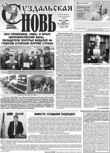 Газета основана 21 марта 1918 г. № 81 (12246) среда, 20 октября 2021 г. Общественно политическая газета Реклама 12+ С 5 по10 октября 2021 года в Москве проходило самое масштабное в России событие в сфере АПК – Неделя агропромышленного комплекса, организованная Минсельхозом России. В ее рамках состоялась XXIII Российская агропромышленная выставка «Золотая осень-2021» – крупнейший в стране смотр достижений сельского хозяйства. Это главный аграрный форум страны на протяжении уже более 20 лет. Российские аграрии и производители привезли то, чем можно гордиться. В этом престижном для сельского хозяйства страны мероприятии приняли участие и наши земляки – ООО Племзавод «Нива» и ФГБНУ «Верхневолжский ФАНЦ». ООО ПЛЕМЗАВОД «НИВА» И ФГБНУ «ВЕРХНЕВОЛЖСКИЙ ФАНЦ» - ОБЛАДАТЕЛИ ЗОЛОТЫХ МЕДАЛЕЙ НА ГЛАВНОМ АГРАРНОМ ФОРУМЕ СТРАНЫ ООО Племзавод «Нива» - золотые медалисты на выставке «Золотая осень» в 2003, 2012, 2013 и 2020 годах. Медалями и дипломами «Золотой осени» награждают аграриев за самые яркие достижения. Основное направление деятельности племзавода - племенная работа и повышение продуктивных качеств молочного скота. В этом году на главном аграрном форуме наша «Нива» представила двух коров черно-пестрой породы. Буренки Рябка и Берта принесли очередное золото в копилку наград племзавода. Продуктивность Рябки 9 301 кг за 305 дней, жирность молока – 4,13 %, белка 3,36 %. Совсем немного уступает рекордсменке Берта, ее продуктивность 8 821 кг за 305 дней, жирность – 4,15 %, белка – 3,27 %. Самые престижные награды «Золотой осени» свидетельствуют о высоком профессионализме работников и умелом руководстве племзавода «Нива» - одного из ведущих сельхозпредприятий Суздальского района, с 2009 года возглавляет которое Олег Якимов. Под его руководством хозяйство значительно увеличило объемы производства. Так, поголовье дойного стада увеличилось до 740 голов, ежегодно растут надои молока – в 2020 году надой на фуражную корову составил 8 912 кг. Реконструируются молочно-товарные фермы и дворы для содержания крупного рогатого скота, ежегодно обновляется сельхозтехника. Формирование крепкой материальной базы - это вклад в будущее хозяйства. ФГБНУ «Верхневолжский ФАНЦ» принял участие в конкурсной программе выставки «За эффективное информационно-консультационное обеспечение АПК» в трех номинациях. В номинации «За разработку и внедрение современных информационных технологий по агропромышленной тематике» золотой медали удостоена, созданная совместно с учеными ФИЦ «Почвенный институт им. В.В. Докучаева» цифровая база данных индикаторов качества почв сельскохозяйственных угодий РФ (БД ИКПСХ). База данных представлена в печатной и компьютерной версии в качестве «Реестра индикаторов качества почв сельскохозяйственных угодий Российской Федерации. Версия1.0» и является руководством для практических работ по кадастровой оценке земель сельскохозяйственного назначения, государственному учету земель, мониторингу почв (земель) сельскохозяйственного назначения, планированию мероприятий по рациональному использованию и охране почвенных ресурсов, для обучения и подготовки специалистов в области проведения почвенных обследований и изысканий. В номинации «За разработку, выпуск научных изданий по агропромышленной тематике» награждена золотой медалью монография доктора сельскохозяйствен