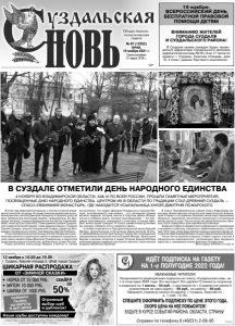 Газета основана 21 марта 1918 г. № 87 (12252) среда, 10 ноября 2021 г. Общественно политическая газета 12+ 19 ноябряВСЕРОССИЙСКИЙ ДЕНЬ БЕСПЛАТНОЙ ПРАВОВОЙ ПОМОЩИ ДЕТЯМ ВНИМАНИЮ ЖИТЕЛЕЙ ГОРОДА СУЗДАЛЯ И СУЗДАЛЬСКОГО РАЙОНА! В Суздале прием граждан будет проводиться адвокатами Суздальского филиала адвокатской конторы №16 с 9 до 17 часов по адресу: г. Суздаль, Красная площадь, дом 10, 2 этаж ( здание Торгового комплекса). • НОРКА ОТ 35 000 РУБ. • МУТОН 10 000 РУБ. • ШАПКИ ОТ 1000 РУБ. 12 ноября с 10.00 до 19.00 г. Суздаль, Красная площадь 5, ЦКиД города Суздаля ШИКАРНАЯ РАСПРОДАЖА ОТ «ЗИМНЕЙ СКАЗКИ» Скидки предоставляет ИП Головина М.Ю. ОГРНИП 311434517800090 Скидки действуют 12.11.2021 г. Реклама НОВИНКА! ПАЛЬТО ИЗ ШЕРСТИ И ЭКО-МЕХА! Наши шубы доступны каждому! Огромный выбор шуб и дубленок! а Суздаля ЖА 0090 у! СКИДКИ ДО 50% В этом году мероприятия прошли с учетом сложной эпидемиологической ситуации. В торжественной церемонии возложения венков к могиле Дмитрия Пожарского приняли участие врио Губернатора Александр Авдеев, председатель ЗС Владимир Киселев, главный федеральный инспектор Сергей Мамеев, сенатор Ольга Хохлова, Глава администрации Суздальского района Алексей Сараев, глава администрации г. Суздаля Сергей Сахаров, епископ Ковровский Стефан, директор Владимиро-Суздальского музея-заповедника Сергей Рыбаков. У восстановленной усыпальницы князей Пожарских участники мероприятия отдали дань памяти и уважения национальному герою нашей страны Дмитрию Пожарскому, а также всем защитникам родного Отечества, доблестным сынам России. Глава региона Александр Авдеев отметил в своем выступлении, что подвиг Дмитрия Пожарского и Кузьмы Минина, возглавляемого ими войска, - это наглядный пример великих лидеров, которые смогли в Смутное время объединиться и победить врага. Сегодня наш общий враг — это пандемия коронавируса, невидимый и злой враг, который забирает жизни наших граждан. И только совместными усилиями мы сможем победить этого коварного врага. 4 ноября отмечается и Праздник Казанской иконы Божией Матери, хранительницы и заступницы Земли русской. В Спасо-Евфимиевом монастыре прошли торжества, посвященные празднованию Казанской иконы Божией Матери. Всенощное бдение и раннюю литургию в храме Успения Божией Матери на Княжем дворе совершил настоятель обители, благочинный Суздаля иеромонах Арсений. В Спасо-Преображенском соборе Спасо-Евфимиева монастыря Божественную литургию возглавил епископ Ковровский Стефан в сослужении казначея монастыря иеромонаха Илариона. Церковные песнопения прозвучали в исполнении монастырского хора. После литургии перед Казанским образом было совершено прославление Богоматери. Владыка Стефан поздравил всех собравшихся с праздником и напомнил о событиях, связанных с обретением иконы, о событиях 1612 года, когда была явлена помощь русскому народу заступничеством Божией Матери по молитвам у Казанской иконы. После богослужения владыка Стефан принял участие в официальных мероприятиях, посвященных Дню народного единства у мемориала князю Дмитрию Пожарскому. Фото spaso-evfimiev.ru и avo.ru В СУЗДАЛЕ ОТМЕТИЛИ ДЕНЬ НАРОДНОГО ЕДИНСТВА 4 НОЯБРЯ ВО ВЛАДИМИРСКОЙ ОБЛАСТИ, КАК И ПО ВСЕЙ РОССИИ, ПРОШЛИ ПАМЯТНЫЕ МЕРОПРИЯТИЯ, ПОСВЯЩЕННЫЕ ДНЮ НАРОДНОГО ЕДИНСТВА. ЦЕНТРОМ ИХ В ОБЛАСТИ ПО ТРАДИЦИИ СТАЛ ДРЕВНИЙ СУЗДАЛЬ — СПАСО-ЕВФИМИЕВ МОНАСТЫРЬ, ГДЕ НАХОДИТСЯ УСЫ