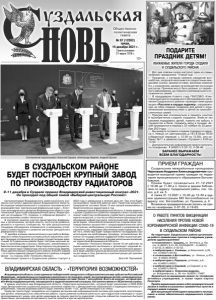 Газета основана 21 марта 1918 г. № 97 (12262) среда, 15 декабря 2021 г. Общественно политическая газета 12+ ПРИЕМ ГРАЖДАН Суздальским межрайонным прокурором Черновым Андреем Александровичем проводится выездной прием граждан на территории муниципального образования Боголюбовское. Прием будет проводиться 21.12.2021 с 10-00 до 11-00 в п. Сокол в здании библиотеки по адресу: Суздальский район, пос. Сокол, д.2, кв. 5. А также 21.12.2021 с 12-00 до 12-30 в здании администрации МО Боголюбовское по адресу: пос. Боголюбово, ул. Пушкина, д. 2. Возможна предварительная запись на прием по телефонам: 2-07-35, 2-19-65. О РАБОТЕ ПУНКТОВ ВАКЦИНАЦИИ НАСЕЛЕНИЯ ПРОТИВ НОВОЙ КОРОНАВИРУСНОЙ ИНФЕКЦИИ COVID-19 В СУЗДАЛЬСКОМ РАЙОНЕ Вот уже совсем скоро наступит один из самых любимых праздников - Новый год! Праздник, с которым связано ожидание волшебства, когда всё наполняется сладостным ожиданием сказки, яркими огнями, веселым смехом! Но, к сожалению, далеко не всем детям эта сказка доступна. Причины могут быть разные, от серьёзного заболевания, до тяжелого материального положения их семей. В преддверии Нового года ГБУСОВО «Комплексный центр социального обслуживания населения Суздальского района» проводит ежегодную акцию «Растопи в сердце льдинку», направленную на сбор сладких подарков для детей c ограниченными возможностями и детей из малообеспеченных семей. Просим вас откликнуться и принять участие в приобретении сладких подарков. Вместе мы сможем порадовать детей, помочь им забыть о трудностях и боли, подарить веру в лучшее. Акция проводится в период с 22 ноября по 22 декабря 2021года. Вы можете оставить сладкие подарки по адресу: п. Новый, ул. Центральная, д.18 с 8.00 до 16.00 (обеденный перерыв- с 12.00 по 13.00), или кабинет №11 в администрации г.Суздаля с 8.00 до 12.00. Дополнительную информацию можно получить по телефонам: 8 (49231) 2-52-12, 2-08-46. ЗАРАНЕЕ ВЫРАЖАЕМ ВСЕМ БЛАГОДАРНОСТЬ! ПОДАРИТЕ ПРАЗДНИК ДЕТЯМ! УВАЖАЕМЫЕ ЖИТЕЛИ ГОРОДА СУЗДАЛЯ И СУЗДАЛЬСКОГО РАЙОНА! На территории Суздальского района организована работа прививочных пунктов в следующих учреждениях здравоохранения: -в поликлинике г. Суздаль, ул. Энгельса, д.10а, тел. 8 (49231) 2-01-22, КОЛЛЦЕНТР – 8 (49231) 2-23-03, 8 (49231) 2-50-52; - в амбулатории с. Сновицы, ул.Вороновой, д.2б, тел. 8 (49231) 64143; - в поликлинике п.Боголюбово, ул. Ленина, д.47а, тел. 8 (4922) 300005; - в амбулатории с.Порецкое, ул.Новая, д.9, тел. 8 (49231) 63331; - в амбулатории п.Садовый, ул.Садовая, д.1а, тел. 8 (49231) 62216; - в амбулатории с. Новоалександрово, ул. Владимирская, д. 39, тел. 8(49231) 73467. Записаться на вакцинацию можно по телефонам лечебных учреждений, а также через портал Госуслуги. Пройти вакцинацию можно и без предварительной записи в любом из указанных прививочных пунктов в порядке живой очереди. Для вакцинации необходимо предъявить паспорт, снилс и полис обязательного медицинского страхования. Организаторами Владимирского инвестиционного конгресса выступили администрация Владимирской области, Ассоциация межрегионального социально-экономического взаимодействия «Центральный федеральный округ», Агентство экономического развития Владимирской области и региональный Туристский информационный центр. Форум прошел на площадках ГТК «Суздаль» в гибридном формате – с использованием онлайн-технологий. В конгрессе приняли участие представители федеральных и региональных органов власти, институтов развития, делового и научного сообще