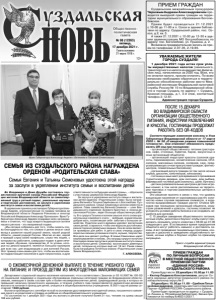 Газета основана 21 марта 1918 г. № 98 (12263) пятница, 17 декабря 2021 г. Общественно политическая газета 12+ ПРИЕМ ГРАЖДАН Суздальским межрайонным прокурором Черновым Андреем Александровичем проводится выездной прием граждан на территории муниципального образования Боголюбовское. Прием будет проводиться 21.12.2021 с 10-00 до 11-00 в п. Сокол в здании библиотеки по адресу: Суздальский район, пос. Сокол, д.2, кв. 5. А также 21.12.2021 с 12-00 до 12-30 в здании администрации МО Боголюбовское по адресу: пос. Боголюбово, ул. Пушкина, д. 2. Возможна предварительная запись на прием по телефонам: 2-07-35, 2-19-65. ПОСЛЕ 15 ДЕКАБРЯ ВО ВЛАДИМИРСКОЙ ОБЛАСТИ ОРГАНИЗАЦИИ ОБЩЕСТВЕННОГО ПИТАНИЯ, ИНДУСТРИИ РАЗВЛЕЧЕНИЙ И КРАСОТЫ, ГОСТИНИЦЫ ПРОДОЛЖАТ РАБОТАТЬ БЕЗ QR-КОДОВ Соответствующие изменения внесены в Указ Губернатора Владимирской области от 17 марта 2020 г. № 38 «О введении режима повышенной готовности». Они отменяют обязанность предъявлять QR-код при посещении: - организаций общественного питания (ресторанов, кафе, столовых, буфетов, баров, закусочных и иных организаций общепита); - организаций индустрии красоты (салонов красоты, парикмахерских, косметических салонов, СПАсалонов, массажных салонов, соляриев, саун, предусматривающих очное присутствие граждан, фитнесцентров, плавательных бассейнов); - организаций досуга граждан (в том числе ночных клубов, дискотек, кинотеатров, кинозалов); - гостиниц и иных мест для временного проживания (туристическая деревня, дом охотника, дом рыбака, фермерский гостевой дом (комнаты), шале, бунгало); - детских развлекательных центров и детских игровых комнат, в том числе расположенных на территории торговых и торгово-развлекательных центров и комплексов. Это решение принято в связи с тем, что уровень вакцинации населения от коронавируса растёт, количество новых случаев заражения снижается, а количество выздоровевших граждан растет. Отмена QRкодов при посещении организаций общепита, индустрии развлечений и красоты, гостиниц позволит не усложнять условия работы бизнеса и не создавать неудобств для жителей. C 15 декабря заведения общественного питания, ночные клубы, дискотеки и боулинг-клубы смогут продолжать оказывать услуги клиентам с 06:00 до 01:00 следующего дня. В оставшееся время предприятия общепита могут работать навынос и доставлять заказы. А вот проведение танцевальных программ, конкурсов и дискотек в заведениях общественного питания, ночных клубах и боулинг-клубах по-прежнему запрещено. Пресс-служба администрации Владимирской области. Во Владимире в Доме Дружбы состоялось торжественное вручение наград Российской Федерации жителям Владимирской области за самоотверженный труд и ратный подвиг, уникальные научные и творческие достижения, за заслуги в укреплении института семьи и воспитании детей. В церемонии приняли участие врио Губернатора Александр Авдеев, уполномоченный по правам человека во Владимирской области Людмила Романова и сенатор Российской Федерации Александр Пронюшкин. Врио Губернатора Александр Авдеев поздравил всех награждаемых и отметил, что труд каждого выдающегося жителя нашего региона - это ежедневный подвиг. «Мы сегодня собрались для того, чтобы сказать слова благодарности тем, кто словом и делом вносит свой вклад в развитие нашей родной земли, нашей родной области, нашей родной России. Многие из вас, верой и пра