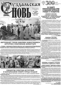 Газета основана 21 марта 1918 г. № 1 (12268) среда, 12 января 2022 г. Общественно политическая газета 12+ Его Высокопреосвященству сослужили благочинный города Суздаля иеромонах Арсений (Смирнов), благочинный Суздальского монастырского благочиния архимандрит Авель (Ургалкин), священники Покровского монастыря. Богослужебные песнопения исполнил монастырский хор. За богослужением молились настоятельница Покровского монастыря игумения Екатерина (Кожевникова), настоятельница Суздальского Ризоположенского монастыря игумения Екатерина (Иванова), настоятельница Свято-Никольского архиерейского подворья в с. Санино монахиня Никона (Чакина), сестры монастыря, прихожане. После богослужения владыка поздравил участников богослужения с Рождеством Христовым и произнёс архипастырское слово. МИТРОПОЛИТ ТИХОН СОВЕРШИЛ БОЖЕСТВЕННУЮ ЛИТУРГИЮ В ПОКРОВСКОМ МОНАСТЫРЕ РОЖДЕСТВО ХРИСТОВО ВСТРЕТИЛИ В КАФЕДРАЛЬНОМ СОБОРЕ ГОРОДА СУЗДАЛЯ 8 января, в попразднство Рождества Христова, в день празднования Собора Пресвятой Богородицы, в Свято-Покровском женском монастыре г. Суздаля состоялась Божественная литургия, возглавил которую митрополит Владимирский и Суздальский Тихон. Примите искренние поздравления с профессиональным праздником — Днем работника прокуратуры Российской Федерации, который отмечается 12 января! Со дня своего основания органы прокуратуры непрерывно подтверждают свое особое назначение в обеспечении верховенства закона, укреплении законности и правопорядка. В ваших рядах служат высококвалифицированные юристы, настоящие профессионалы своего дела, ответственно и честно исполняющие свой долг. Для каждого сотрудника службы такие качества как честь, справедливость, принципиальность являются главными и в работе, и в жизни. От вашего труда во многом зависит вера людей в закон, формирование правовой культуры населения. Уверены, что и в дальнейшем вы с честью будете защищать интересы государства и лично каждого жителя нашего района. От всей души желаем вам и вашим семьям счастья, здоровья, благополучия, новых свершений в благородном деле служения Отечеству! Пусть ваш высокий профессионализм, глубокие правовые знания и богатый жизненный опыт позволят жителям района всегда чувствовать себя под надежной защитой Закона! С праздником! А.П. САРАЕВ, Глава администрации Суздальского района. В.В. КИРИЛЛОВ, Глава Суздальского района. УВАЖАЕМЫЕ СОТРУДНИКИ И ВЕТЕРАНЫ ПРОКУРАТУРЫ СУЗДАЛЬСКОГО РАЙОНА! УВАЖАЕМЫЕ РАБОТНИКИ И ВЕТЕРАНЫ ПРОКУРАТУРЫ! УВАЖАЕМЫЕ РАБОТНИКИ И ВЕТЕРАНЫ ПРОКУРАТУРЫ! ПОЗДРАВЛЯЮ ВАС С ПРОФЕССИОНАЛЬНЫМ ПРАЗДНИКОМ И 300-ЛЕТИЕМ ОРГАНОВ ПРОКУРАТУРЫ РОССИИ! НА ЗАЩИТЕ КОНСТИТУЦИОННЫХ ПРАВ И ЗАКОННЫХ ИНТЕРЕСОВ ГРАЖДАН И ГОСУДАРСТВА Прокуратура Владимирской области сегодня - это мощный, слаженный коллектив, надёжная опора нашей государственности. Высокая компетентность, порядочность, верность долгу - вот те качества, которые присущи прокурорам. В 2021 году работники прокуратуры региона проделали значительную работу по защите конституционных прав и законных интересов граждан и интересов государства. Под особым вниманием остаются вопросы социальной защищённости инвалидов, ветеранов и детей. Благодаря вашему чёткому следованию российскому законодательству, опыту и честности раскрываемость преступлений неуклонно растёт. 