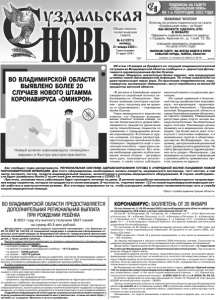 Газета основана 21 марта 1918 г. № 4 (12271) пятница, 21 января 2022 г. Общественно политическая газета 12+ ВО ВЛАДИМИРСКОЙ ОБЛАСТИ ВЫЯВЛЕНО БОЛЕЕ 20 СЛУЧАЕВ НОВОГО ШТАММА КОРОНАВИРУСА «ОМИКРОН» «В регионе в ближайшие недели ожидается серьёзный всплеск заболеваемости «Омикроном». Наиболее уязвимая категория населения – дети, поскольку они не привиты от коронавируса», – подчеркнул Артём Осипов. Глава медицинского ведомства отметил, что «Омикрон» вызывает менее тяжёлое течение ковида, но за счёт более высокого уровня заболеваемости ожидается увеличение числа тяжелобольных пациентов по сравнению с предыдущими волнами коронавируса. В отличие от других штаммов, которые распространяются воздушно-капельным путём, «Омикрон» передаётся ещё и контактным способом – через руки и загрязнённые поверхности. Вот почему необходимо уделять особое внимание личной гигиене – регулярно мыть руки, пользоваться антисептиками, а также строго соблюдать масочный режим и социальную дистанцию. «Но самый надёжный и безопасный метод профилактики коронавируса – это вакцинация, – акцентировал Артём Алексеевич. – Призываю жителей Владимирской области в самое ближайшее время обязательно сделать прививку. Ревакцинация допустима даже спустя четыре месяца после болезни. Не обязательно ждать полгода. Рекомендую делать прививку не в медицинских организациях, где более высок риск столкнуться с носителем инфекции, а в прививочных пунктах в общественных местах. Во Владимире – это, например, центральный вакцинальный пункт, развернутый в драмтеатре. На сайте Департамента здравоохранения есть раздел «Вакцинация», где приведена актуальная информация о режиме работы прививочных пунктов, указаны их адреса». Об этом 19 января на брифинге по текущей эпидемиологической ситуации во Владимирской области сообщил и.о. директора Департамента здравоохранения Артём Осипов. Штамм «Омикрон» значительно более заразен, чем предыдущие штаммы новой коронавирусной инфекции. По этому показателю он даже превосходит вирус кори. По прогнозам эпидемиологов, коронавирусом, вызванным «Омикроном», могут переболеть не менее 50 процентов жителей области. Как сообщил глава департамента, РЕГИОНАЛЬНАЯ СИСТЕМА ЗДРАВООХРАНЕНИЯ ГОТОВА К ОЧЕРЕДНОЙ ВОЛНЕ ПАНДЕМИИ НОВОЙ КОРОНАВИРУСНОЙ ИНФЕКЦИИ. Для этого сформированы необходимые запасы лекарств, медицинского кислорода, тест-систем, в том числе экспресс-тестов, средств индивидуальной защиты, антисептиков и резервы медицинского оборудования. В случае необходимости будет развёрнуто более 3 тысяч коек для лечения пациентов с COVID-19. При этом, основная часть заболевших будет проходить лечение на дому. В регионе проработан механизм амбулаторного сопровождения ковид-пациентов, которые не нуждаются в госпитализации. В частности, «горячая линия» 122 по новой коронавирусной инфекции начнёт работать в круглосуточном режиме. Все эти меры направлены на то, чтобы разгрузить амбулаторно-поликлиническую сеть и службу скорой медицинской помощи. Пресс-служба администрации области. Справки по телефону 8 (49231) 2-08-95 УВАЖАЕМЫЕ ЧИТАТЕЛИ! Если вы не успели подписаться на газету «Суздальская новь», не беда! ВЫ МОЖЕТЕ СДЕЛАТЬ ЭТО В ЯНВАРЕ! Оформить подписку можно по адресу: г. Суздаль, Красная пл., д. 1 (каб. 12,18). ВЫПИСАВ ГАЗЕТУ, ВЫ ВСЕГДА БУДЕТЕ В КУРСЕ СОБЫТИЙ ГОРО
