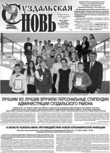 Газета основана 21 марта 1918 г. № 6 (12273) пятница, 28 января 2022 г. Общественно политическая газета 12+ Торжественное мероприятие состоялось в актовом зале администрации Суздальского района. На мероприятии присутствовали Глава администрации района Алексей Сараев, начальник управления образования администрации района Ольга Богданова, начальник отдела по культуре, спорту, семье и молодежной политике администрации района Галина Ильина. Алексей Сараев вручил 36 стипендий. Их удостоены студенты Суздальского индустриально-гуманитарного колледжа, Владимирского аграрного колледжа, Суздальского филиала Санкт-Петербургского государственного института культуры, а также учащиеся детских школ искусств и образовательных организаций района. Пять ребят отмечены за достижения в спорте, двое – за активное участие в общественном движении, семеро проявили себя в области культуры и творчества, больше всего награжденных в номинации «образование и наука». Кроме теплых слов поздравлений, денежного вознаграждения, сладких подарков были и подарки музыкальные от учащихся Садовой детской школы искусств. Причем, среди выступавших были и нынешние стипендиаты Всеволод Кузнецов и Жастин Матвеев. Музыкальные поздравления прозвучали от артистов Межпоселенческого методического культурно-досугового центра Суздальского района Натальи Козловой, Евгения Гусева, Александра Каткова. На память стипендиаты сфотографировались с Главой адмистрации района Алексеем Сараевым. Фото М.Пахомовой. Список стипендиатов смотрите на 8 стр. ЛУЧШИМ ИЗ ЛУЧШИХ ВРУЧИЛИ ПЕРСОНАЛЬНЫЕ СТИПЕНДИИ АДМИНИСТРАЦИИ СУЗДАЛЬСКОГО РАЙОНА Фото на память после вручения стипендий с Главой администрации Суздальского района Алексеем Сараевым. ВОЛОНТЁРЫ ВЛАДИМИРСКОЙ ОБЛАСТИ АКТИВИЗИРОВАЛИ АКЦИЮ СОЦИАЛЬНОЙ ВЗАИМОПОМОЩИ «МЫ ВМЕСТЕ» Во Владимирской области волонтёры, соблюдая меры предосторожности, продолжают помогать пожилым и маломобильным гражданам избегать рисков заразиться коронавирусом. Добровольцы покупают им продукты и выписанные врачом лекарства, оплачивают счета за коммунальные услуги. Номер «горячей линии», по которой можно обратиться к волонтёрам: 8 (800) 200-34-11. Граждане могут предложить другим свою помощь, нажав на кнопку «Стать волонтёром» на сайте: https://dobro.ru. Символично, что именно в День российского студенчества в администрации Суздальского района отметили одаренных детей, подростков, студентов вручением стипендий администрации района. Такая мера поддержки адресована молодым людям, добившимся особых успехов в учёбе, спорте, творческой деятельности и общественной жизни. В регионе по-прежнему запрещено проведение массовых мероприятий с количеством участников более 500 человек. Исключение составляют массовые мероприятия в организациях образования и культуры, а также физкультурные и спортивные мероприятия. Допускается проведение массовых зрелищных, физкультурных и спортивных мероприятий в организациях культуры, в объектах спорта с максимальным числом зрителей не более 50 процентов от общей вместимости зала при условии соблюдения санитарно-эпидемиологических требований. Это максимальное число зрителей может быть увеличено, если в мероприятии участвуют лица, имеющие действующий QR-код, сертификат или справку о сделанной профилактической прививке от COVID-19 и