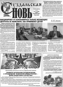 Газета основана 21 марта 1918 г. № 13 (12280) среда, 23 февраля 2022 г. Общественно политическая газета 12+ УВАЖАЕМЫЕ ЖИТЕЛИ И ГОСТИ СУЗДАЛЬСКОЙ ЗЕМЛИ! ПРИМИТЕ ИСКРЕННИЕ ПОЗДРАВЛЕНИЯ С ПРАЗДНИКОМ ВОИНСКОЙ СЛАВЫ РОССИИ — ДНЁМ ЗАЩИТНИКА ОТЕЧЕСТВА! В этот праздничный день выражаем признательность и глубокое уважение всем защитникам России – бывшим, настоящим и будущим. Защита своей Отчизны, своего дома – первейший долг, выполнение которого для каждого – дело чести. Мужество, патриотизм, сила духа и самоотверженность испокон веков были символами российского воинства, а воинская доблесть была и остается одним из главных мужских качеств. Именно поэтому 23 февраля стало всенародным праздником, днём всех мужественных, твёрдых духом людей. Любой россиянин, прежде всего, защитник своей Родины. Среди них немало женщин, которые своим трудом ежедневно вносят достойный вклад в дело служения Отечеству. В ЭТОТ ДЕНЬ ОТ ДУШИ ЖЕЛАЕМ ДОБРА, СЧАСТЬЯ, СОГЛАСИЯ И БЛАГОПОЛУЧИЯ КАЖДОЙ СЕМЬЕ. ПУСТЬ ЭТОТ ПРАЗДНИК ВСЕГДА БУДЕТ МИРНЫМ И РАДОСТНЫМ! Коллектив ООО «Промрукав». На заседании комитета по социальной политике Законодательного Собрания. Прививать подростков от коронавируса будут лишь добровольно и только после тщательного осмотра. Члены комитета по соцполитике задали самые острые вопросы по детской вакцинации врио директора департамента здравоохранения Артему Осипову. 24 января во Владимирскую область пришла первая партия вакцины ГамКОВИД-Вак-М и началась детская прививочная кампания. Мнения о ней еще более противоречивые, чем по поводу взрослой. Учитывая большой общественный резонанс, депутаты еще в конце января на заседании Заксобрания попросили департамент подготовить и представить информацию о том, как будет организована работа по вакцинации детей. И вот есть первые цифры. Их и представил на заседании комитета по социальной политике и здравоохранению врио директора профильного департамента АВО Артем Осипов. Из 76 тысяч владимирских подростков в возрасте 12-17 лет желание сделать прививку изъявили 5 тысяч – это чуть менее 7%. Первый компонент введен 300 детям, при том, что всего в область пока поступило 720 комплектов Гам-КОВИД-Вак-М. По оценкам облздрава, процесс идет в штатном режиме, а небольшое количество вакцинированных объясняется текущей эпидемиологической ситуацией. «Кто-то заболел, кто-то недавно выздоровел и у него пока медотвод, ВАКЦИНИРУЮТ ОТ КОРОНАВИРУСА ТОЛЬКО ЖЕЛАЮЩИХ! ДЕПУТАТЫ ЗС ВЫЯСНЯЛИ, КАК ПРИВИВАЮТ ДЕТЕЙ кто-то просто опасается обращаться в поликлинику, когда там столько больных. Люди звонят и просят перенести их на более поздние сроки», – пояснил врио директора департамента здравоохранения Артем Осипов. Два самых острых вопроса, на которые депутаты хотели получить исчерпывающие ответы: хватит ли прививок всем желающим и как будет обеспечена добровольность вакцинации. В облздраве заверили, что заявки на очередные поставки Гам-КОВИД-Вак-М уже направлены, так что все желающие хоть и не одномоментно, но будут обеспечены. Добровольность вакцинации также гарантирована. «Никаких разнарядок или целевых показателей по детской вакцинации нет и не будет. Только те, кто сам пожелает. И только после тщательно медицинского осмотра. По закону информированное согласие на прививку подписывают родители, но с 15 лет подросток имеет право