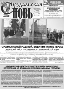 Газета основана 21 марта 1918 г. № 14 (12281) пятница, 25 февраля 2022 г. Общественно политическая газета 12+ В Суздальском районе акция прошла у мемориала «Вечный огонь» в городе Суздале и у памятника великому полководцу Александру Суворову в с. Кистыш. В них приняли участие Глава администрации района Алексей Сараев, его заместители Александр Авсеенок и Сергей Белов, глава администрации города Суздаля Сергей Сахаров, глава администрации Селецкого сельского поселения Николай Курашкин, а также учащиеся школ г. Суздаля (на снимках). Участники акции почтили память героев минутой молчания и возложили цветы к памятникам в обоих населенных пунктах. «Символично, что акция проходит в День защитника Отечества – отметил Глава администрации района Алексей Сараев. - Этот праздник важен и дорог не только для военнослужащих, но и для каждого человека, который гордится своей Родиной и готов защищать ее интересы. Мы отдаем дань памяти воинам всех поколений, чествуем тех, кто сегодня стоит на страже независимости России и мирной жизни ее граждан. Цветы сегодня - это наше уважение к каждому, кто воевал и работал в тылу, к каждому кто боролся и одержал Победу. Россия помнит своих героев». Фото М. Пахомовой. ГОРДИМСЯ СВОЕЙ РОДИНОЙ, ЗАЩИТИМ ПАМЯТЬ ГЕРОЕВ СУЗДАЛЬСКИЙ РАЙОН ПРИСОЕДИНИЛСЯ К ВСЕРОССИЙСКОЙ АКЦИИ 23 февраля во всех регионах нашей страны прошла Всероссийская акция «Защитим память героев». В этот день к мемориалам и воинским захоронениям возлагают красные гвоздики, которые стали символом нашей памяти и уважения к ветеранам и тем, кто не вернулся с самой страшной войны в истории. Во Владимирской области ждут прибытия порядка полутора тысяч жителей Донбасса, которые экстренно эвакуировались в Российскую Федерацию после эскалации обстановки в Народных Республиках. С самого начала к подготовке встречи вынужденных переселенцев подключились волонтёры акции взаимопомощи #МыВместе. На базе комплексных центров социального обслуживания населения Владимирской области открыты пункты приёма гуманитарной помощи. Собранные предметы первой необходимости, детские игрушки, канцтовары волонтёры доставят жителям ДНР и ЛНР, которые прибудут в наш регион. «Сейчас всё похоже на то, как начиналась пандемия - времени мало, а надо действовать быстро и чётко. В подготовку к встрече вынужденных переселенцев вовлечены все структуры. На общей установочной встрече разработали схему сотрудничества. Первое - отрабатываем алгоритм по встрече людей. Волонтёры будут распределены по локациям, у каждой группы - своя зона ответственности. Будут развёрнуты палатки МЧС с горячим чаем, готовы автобусы, которые доставят людей в пункты временного размещения. Очень помогает информация из штабов других регионов, которые уже встретили жителей Донбасса. Здесь очень чувствуется, что #МыВместе!», - отметила руководитель регионального штаба #МыВместе Светлана Георгиева. Во Владимирской области подготовлен 21 пункт временного размещения граждан – это организации областного подчинения, муниципальные общежития и социальные учреждения. В пунктах созданы необходимые бытовые условия, организовано питание, сбор гуманитарной помощи. Там же вынужденные переселенцы при помощи сотрудников центров социального обслуживания смогут оформить лицевые счета для получения единовременной мате