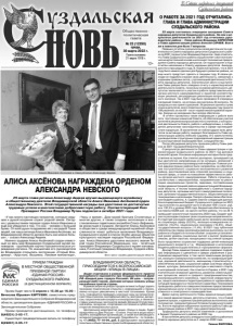 Газета основана 21 марта 1918 г. № 23 (12290) среда, 30 марта 2022 г. Общественно политическая газета 12+ «У нас много настоящих патриотов, которые сердцем и душой искренне служат родной земле. Сегодня с удовольствием передал орден Алисе Ивановне и ещё раз убедился в том, что она – человек с большой буквы. От всей души поздравляю её с наградой! Таких людей, как наша легенда Алиса Ивановна Аксёнова, во Владимирской области должно быть как можно больше», - сказал Александр Авдеев. Именно трудами Алисы Аксёновой создан известный на весь мир Владимиро-Суздальский музей-заповедник - крупнейшее научно-просветительское учреждение региона. По инициативе его руководителя во Владимире открылись экспозиции «Старый Владимир», «Хрусталь. Вышивка. Лаковая миниатюра», АЛИСА АКСЁНОВА НАГРАЖДЕНА ОРДЕНОМ АЛЕКСАНДРА НЕВСКОГО «Часы и время», Дом-музей братьев Столетовых и многие другие, а также созданы экспозиции в восстановленных памятниках ансамбля Спасо-Евфимиева монастыря в Суздале. Авторитет Алисы Аксёновой в обществе и среди международной музейной общественности помог добиться включения ВладимироСуздальского музея в список Особо ценных объектов культурного наследия народов Российской Федерации. Алиса Ивановна удостоена высокого звания Герой труда Российской Федерации, она - почётный президент Владимиро-Суздальского музея-заповедника, Почётный гражданин Владимира, Суздаля и Владимирской области. Фото пресс-службы администрации области. 25 марта глава региона Александр Авдеев вручил выдающемуся музейному и общественному деятелю Владимирской области Алисе Ивановне Аксёновой орден Александра Невского. Этой государственной награды она удостоена за достигнутые трудовые успехи и многолетнюю добросовестную работу. Соответствующий Указ Президент России Владимир Путин подписал в октябре 2021 года. Алиса Ивановна Аксенова и глава региона Александр Авдеев. О РАБОТЕ ЗА 2021 ГОД ОТЧИТАЛИСЬ ГЛАВА И ГЛАВА АДМИНИСТРАЦИИ СУЗДАЛЬСКОГО РАЙОНА 23 марта состоялось очередное заседание Совета народных депутатов Суздальского района. На нем о результатах деятельности за 2021 год отчитались руководители района – Глава района Владимир КИРИЛЛОВ и Глава администрации района Алексей САРАЕВ. Всего же в повестке дня было 7 вопросов. Первым с отчетом о результатах своей деятельности и деятельности Совета народных депутатов Суздальского района за 2021 год выступил Владимир Кириллов. Надо отметить, что Глава Суздальского района осуществляет свои полномочия на непостоянной основе и исполняет полномочия председателя Совета народных депутатов. Он подконтролен и подотчетен населению и Совету народных депутатов. Анализируя итоги прошедшего года, В. Кириллов признал, что в 2021 году было немало сделано для будущего развития района, но еще много предстоит сделать в текущем году. В своем докладе он подробно отразил свою деятельность, связанную с изданием правовых актов, с организацией деятельности Совета народных депутатов. Значительное место в выступлении Главы района было отведено отчету о нормотворческой деятельности Совета, поскольку основная деятельность депутатов заключается в участии в работе представительного органа местного самоуправления и принятий соответствующих решений, регулирующих реализацию вопросов местного значения. Так в 2021 году было проведено