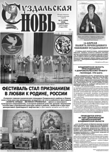 Газета основана 21 марта 1918 г. № 27 (12294) среда, 13 апреля 2022 г. Общественно политическая газета 12+ ФЕСТИВАЛЬ СТАЛ ПРИЗНАНИЕМ В ЛЮБВИ К РОДИНЕ, РОССИИ 8 апреля главная сценическая площадка Суздальского района в Новом селе стала местом проведения четвертого по счету районного фестиваля «ЗАЖЕЧЬ СЕРДЦА – ВЕЛИКОЕ ПРИЗВАНЬЕ» - яркого и массового культурного мероприятия, в котором приняли участие лучшие творческие коллективы учреждений культуры нашего района, любители и мастера декоративно-прикладного творчества (о фестивале читайте на 4-5 стр.). 14 АПРЕЛЯ - ПАМЯТЬ ПРЕПОДОБНОГО ЕВФИМИЯ СУЗДАЛЬСКОГО С первых дней своей истории, неизъяснимым образом, Суздаль полнится людьми святыми, крепнет и раскрывается в красоте душ их и подвигов. В каждом камне и в каждой улице Богоспасаемого града оставлен свет дел подвижников веры. Нельзя из них выделить более важных или более значимых. Преподобный Евфимий Суздальский - один из них. (Читайте на 20 стр.). Икона преподобного Евфимия Суздальского. Написана для Спасо-Евфимиева монастыря суздальскими художниками Галиной и Эдуардом Коротковыми. ВЛАДИМИРСКАЯ ОБЛАСТЬ ПРИСОЕДИНИЛАСЬ К ДОБРОВОЛЬЧЕСКОМУ ПРОЕКТУ «ЧЕЛЛЕНДЖ «ТРИ ШАГА» Фонд поддержки детей, находящихся в трудной жизненной ситуации, вновь дал старт Всероссийской акции «Челлендж «Три шага». Это событие объединит подростков из всех регионов страны для оказания помощи и поддержки сверстникам. Присоединятся к их числу и ребята из Владимирской области, сообщает Департамент социальной защиты населения. В 2021 году добровольческий проект был успешно проведён социально-реабилитационными центрами для несовершеннолетних нашего региона. Более 200 подростков совершили добрые дела и исполнили желания, организовав друг для друга мастер-классы по рукоделию, рисованию, анимации, конструированию и флористике, спортивные игры на свежем воздухе, экскурсии, коллективное чтение книг и прогулки с животными. В апреле и мае юные жители области найдут новых друзей, помогут им в решении проблем и реализации желаний, обменяются тайными подарками. Завершится челлендж 15 мая: к этому дню каждый участник-доброволец в социальной сети «ВКонтакте» создаст пост о своём тайном друге и добрых делах. Подробную информацию об участии в челлендже можно узнать в организациях социального облуживания по месту жительства. Адреса и телефоны учреждений размещены на официальном сайте Департамента социальной защиты населения dszn@avo.ru. ПРОВОДИТСЯ ОПРОС НА ТЕМУ ЦИФРОВИЗАЦИИ ЗДРАВООХРАНЕНИЯ ВЛАДИМИРСКОЙ ОБЛАСТИ С 11 по 29 апреля на Едином портале госуслуг (ЕПГУ) проходит опрос среди жителей Владимирской области по теме «Цифровизация здравоохранения». Гражданам предлагается ответить на вопросы: пользуются ли они услугами «Запись на приём к врачу через ЕПГУ», «Электронный листок нетрудоспособности» и «Получение сведений об оказании медицинских услуг». Для того, чтобы принять участие в опросе, необходимо зайти на официальный сайт Департамента здравоохранения dz.avo.ru, кликнуть на баннер «Мой выбор, моё будущее» (общественное голосование на портале госуслуг), далее выбрать – опросы (цифровизация здравоохранения). Опрос проводится для изучения осведомлённости граждан о процессах цифровизации региональной системы здравоохранения и активности пользования цифровыми услугами в этой сфер