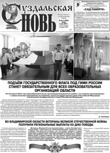 Газета основана 21 марта 1918 г. № 33 (12300) среда, 4 мая 2022 г. Общественно политическая газета 12+ Данное мероприятие проводится с целью изучения истории государственных символов Российской Федерации. Начиная с 1 мая 2022 г., оно вводится в постоянную практику воспитательной работы каждой образовательной организации. С 1 сентября такую практику введут во всех школах страны. Школам рекомендуется проводить поднятие Государственного флага в начале учебной недели, а спуск – в конце. Воспитание обучающихся является неотъемлемой частью образования. Воспитание призвано обеспечить формирование у обучающихся основ российской идентичности. Государственные символы – консолидирующая основа формирования общероссийской гражданской идентичности для подрастающего поколения, является неотъемлемой составной частью образовательного процесса, включается в изучение на всех уровнях образования при реализации основных и дополнительных образовательных программ, программ воспитания. ПОДЪЁМ ГОСУДАРСТВЕННОГО ФЛАГА ПОД ГИМН РОССИИ СТАНЕТ ОБЯЗАТЕЛЬНЫМ ДЛЯ ВСЕХ ОБРАЗОВАТЕЛЬНЫХ ОРГАНИЗАЦИЙ ОБЛАСТИ В организациях отдыха детей и их оздоровления рекомендуется еженедельное поднятие (спуск) Государственного флага Российской Федерации. Поднятие, как правило, осуществляется при церемонии открытия, открытия профильных фестивалей, спортивных соревнований, в дни единых действий, посвященных государственным праздникам Российской Федерации и особо значимым датам, спуск – при церемонии закрытия, закрытия профильных фестивалей, спортивных соревнований, окончании дней единых действий и др. Обеспечение школ государственной символикой России предусмотрено в рамках федерального проекта «Патриотическое воспитание граждан Российской Федерации» нацпроекта «Образование». М. ПАХОМОВА. 25-26 апреля 2022 года общеобразовательные организации Суздальского района (на снимках) присоединились к торжественному мероприятию по поднятию, выносу Государственного флага Российской Федерации и исполнению Государственного гимна Российской Федерации. В апреле финансовую поддержку из областного бюджета ко Дню Победы получили свыше 6,1 тыс. ветеранов Великой Отечественной войны на сумму 25,2 млн рублей, сообщает Департамент социальной защиты населения Владимирской области. Единовременная выплата в размере 6000 рублей перечислена 194 инвалидам и участникам войны. По 4 тысячи рублей получили 190 бывших несовершеннолетних узников фашистских концлагерей, 97 лиц, награждённых знаками «Жителю блокадного Ленинграда» или «Жителю осажденного ВО ВЛАДИМИРСКОЙ ОБЛАСТИ ВЕТЕРАНЫ ВЕЛИКОЙ ОТЕЧЕСТВЕННОЙ ВОЙНЫ ПОЛУЧИЛИ РЕГИОНАЛЬНЫЕ ВЫПЛАТЫ КО ДНЮ ПОБЕДЫ Севастополя», а также 5636 тружеников тыла. Наряду с ветеранами Великой Отечественной войны региональную поддержку ко Дню Победы также получили свыше 69,5 тыс. «детей войны» (на сумму 79,8 млн рублей, размер выплаты – 1132 рубля) и 1383 вдовы погибших инвалидов и участников войны (на сумму 5,6 млн рублей, размер выплаты - 4082 рубля). Гражданам, относящимся одновременно к нескольким льготным категориям, перечислены средства по каждому из имеющихся оснований. «Ветераны Великой Отечественной войны - эталон беззаветного патриотизма, самоотдачи до самопожертвования, мужества, воли к победе. Как мало их осталось, тех, кто может говорить о самых страшных и