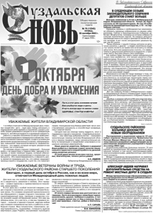 Газета основана 21 марта 1918 г. № 76 (12343) пятница, 30 сентября 2022 г. Общественно политическая газета 12+ 1 октября отмечается Международный день пожилых людей.Эта дата – ещё один повод напомнить о неразрывной связи времён и поколений, сказать спасибо людям уважаемого возраста за их гражданскую зрелость, житейскую мудрость и душевную щедрость. Забота о старшем поколении остаётся нравственной основой здорового гражданского общества. Улучшить положение пожилых людей, создать условия для увеличения продолжительности жизни, самореализации, повышения творческой активности, трудовой занятости – это задачи, которые сегодня решаются как в стране, так и в регионе. За плечами наших старших товарищей – большая жизнь с её радостями и трудностями, удачами и потерями, а также тяжёлым трудом, который обеспечил нашей стране экономическую и социальную стабильность. Эта самоотверженность и верность долгу являются примером для тех, кто сейчас защищает границы нашего государства, и для тех, кто помогает людям, покинувшим зону боевых действий: лечит, восстанавливает документы и способствует возвращению к мирной жизни. Сегодня нам как никогда нужны мудрость, опыт и поддержка старшего поколения. «Серебряные волонтёры» – наш авангард добровольчества – оказывают значительную помощь жителям Владимирской области в период пандемии, ведут разъяснительную работу по вакцинации и продолжают участвовать в социально значимых мероприятиях. Наши дорогие родители, бабушки и дедушки! Ваша доброта и терпение служат залогом национального единства и опорой в работе по дальнейшему развитию региона. От всей души желаю всем вам счастья, здоровья, благополучия, тепла и уюта в домах! А.А. АВДЕЕВ, Губернатор Владимирской области. УВАЖАЕМЫЕ ЖИТЕЛИ ВЛАДИМИРСКОЙ ОБЛАСТИ! Для всех нас это особый праздник. В нем – тепло и сердечность, уважение и любовь. Этот праздник – символ единства и преемственности поколений, связи времен. В этот день мы с особой теплотой говорим о людях старшего поколения, у которых за плечами большая жизнь. Со словами искренней признательности мы обращаемся к людям старшего поколения, чей самоотверженный труд, терпение и мужество стали основой нашей сегодняшней жизни. Это вам мы обязаны всем, что у нас есть, и чем мы гордимся сегодня – сильной и единой страной, мирным небом над головой и возможностью жить и работать в свободной стране. Ваш патриотизм, самоотдача, целеустремлённость, трудолюбие, готовность многим жертвовать ради Родины заслуживают всеобщего уважения и являются примером для нас и подрастающих поколений. От имени администрации и Совета народных депутатов Суздальского района примите слова благодарности и признательности за ваш неоценимый вклад в развитие района, за заботу о его процветании, верность идеалам. От всего сердца желаем вам долголетия и оптимизма. Пусть всегда рядом с вами будут единомышленники, друзья, любимые и родные, а тепло их сердец хранит вас от бед и невзгод. Крепкого вам здоровья, счастья, добра и благополучия! А.П. САРАЕВ, Глава администрации Суздальского района. В.В. КИРИЛЛОВ, Глава Суздальского района. УВАЖАЕМЫЕ ВЕТЕРАНЫ ВОЙНЫ И ТРУДА, ЖИТЕЛИ СУЗДАЛЬСКОГО РАЙОНА СТАРШЕГО ПОКОЛЕНИЯ! Ежегодно, в первый день октября в России, как и во всем мире, отмечается Международный день пожилых людей. Внесены изменения в У