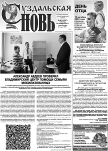 Газета основана 21 марта 1918 г. № 80 (12347) пятница, 14 октября 2022 г. Общественно политическая газета 12+ «Такие центры помощи сейчас выполняют очень важную функцию – поддерживают связь с родителями, детьми, жёнами резервистов и доводят до них только достоверную и проверенную информацию. Здесь семьи мобилизованных граждан могут получить консультацию различных специалистов: психологов и юристов, судебных приставов, сотрудников миграционной службы, банковских и социальных работников. Они детально объяснят, как поступать в той или иной ситуации. Много обращений поступает по выплатам. Мы приняли решение, что на этой неделе все наши резервисты получат по 100 тысяч рублей от региона. У многих семей есть потребность в понимании, как обеспечены мобилизованные. В частности, есть сигналы о том, что у владимирских ребят в учебных частях в других регионах имеются проблемы с материальным снабжением и экипировкой. Съездим, разберёмся, возьмём на контроль решение вопросов, с которыми столкнулись там наши земляки. Параллельно решаем вопросы по материальному обеспечению и налаживанию быта в учебном центре в Коврове. Поддержка мобилизованных и их семей будет продолжена», – заверил Александр Авдеев. По поручению главы региона Департамент социальной защиты населения организовал несколько сотен выездов в семьи мобилизованных граждан для уточнения потребностей. За каждой семьёй закреплён куратор. Помогают в этой важной работе и волонтёры. Обращения от граждан поступают АЛЕКСАНДР АВДЕЕВ ПРОВЕРИЛ ВЛАДИМИРСКИЙ ЦЕНТР ПОМОЩИ СЕМЬЯМ МОБИЛИЗОВАННЫХ 11 октября Губернатор Александр Авдеев посетил центр помощи семьям мобилизованных граждан, открытый неделю назад на базе семейного многофункционального центра во Владимире, пообщался с его сотрудниками и посетителями. УВАЖАЕМЫЕ ЖИТЕЛИ ВЛАДИМИРСКОЙ ОБЛАСТИ! Поздравляю вас с молодым, но уже полюбившимся российским праздником – Днём отца! Он напоминает нам о важнейшей роли мужчины в воспитании детей и о том, что семья обязательно должна быть полной. Отцы – крепкое плечо и пример во всём. Они помогают своим детям стать самостоятельными и сильными, учат защищать слабых и не бояться трудностей. Сегодня, когда Россия отстаивает свой суверенитет, спасает народ Донбасса и жителей освобождённых от неонацистов территорий, наши мужчины – главы семейств, мужья, славные сыны Отчизны – встают на её защиту. Недаром слова отец и Отечество имеют общий корень. Настоящий мужчина, отец - фундамент своей семьи и опора всего государства. Дорогие друзья, от души желаю вам крепкого здоровья, неиссякаемой энергии и удачи! А.А. АВДЕЕВ, Губернатор области. 16 октября 2022 года (праздник отмечается в третье воскресенье октября) ДЕНЬ ОТЦА ДОРОГИЕ ЖЕНЩИНЫ, ПРОЖИВАЮЩИЕ В СЕЛЬСКОЙ МЕСТНОСТИ! От всей души поздравляем вас со Всемирным днем сельских женщин, который отмечается 15 октября! Этот праздник – прекрасная возможность сказать слова благодарности и признательности вам, сельским труженицам, которые вносят неоценимый вклад в развитие и процветание района. День сельских женщин объединяет тружениц всех профессий, проживающих в сельской местности. Жизнь на селе никогда не была легкой. На ваших хрупких плечах лежит множество забот. Вы играете большую роль не только в развитии сельского хозяйства, но и в жизни села. Ваша общественная д