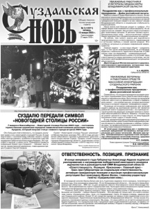 Газета основана 21 марта 1918 г. № 2 (12371) пятница, 13 января 2023 г. Общественно политическая газета 12+ УВАЖАЕМЫЕ ВЕТЕРАНЫ И РАБОТНИКИ СРЕДСТВ МАССОВОЙ ИНФОРМАЦИИ СУЗДАЛЬСКОГО РАЙОНА! Поздравляем вас с профессиональным праздником - Днем российской печати! Символично, что эта дата приходится на самое начало года и подчеркивает роль средств массовой информации в современном мире. Быть всегда на передовой событий, идти в ногу со временем, а порой и задавать ритм жизни — это особая миссия, которую выполняют печатные и интернет-издания, телевидение и радио. Основным источником информации для жителей нашего района на протяжении многих лет является районная газета «Суздальская новь», на страницах которой коллектив редакции освещает важные и значимые события района и области. Уверены, что ваш труд не утратит ценности и годы спустя, по нему будущие поколения станут судить о нашей эпохе. В этот праздничный день выражаем благодарность всем работникам средств массовой информации района за верность своему призванию и любовь к родному краю, за профессионализм и стремление к постоянному самосовершенствованию. От всей души поздравляем вас с профессиональным праздником! Оставайтесь всегда интересными для своих читателей. Желаем вам ярких, запоминающихся журналистских материалов и благодарных читателей! Счастья, здоровья и благополучия вам и вашим близким! А.П. САРАЕВ, Глава администрации Суздальского района. В.В. КИРИЛЛОВ, Глава Суздальского района. УВАЖАЕМЫЕ РАБОТНИКИ И ВЕТЕРАНЫ МЕДИАСФЕРЫ ВЛАДИМИРСКОЙ ОБЛАСТИ! Поздравляю вас с профессиональным праздником – Днём российской печати. Важность вашего труда переоценить сложно. На вас миссия не только информационная, но и аналитическая, и просветительская. От профессионализма и активной гражданской позиции каждого из вас зависит имидж Владимирской области и социальная стабильность внутри региона. Наша жизнь всё больше уходит в «цифру». И в сфере медиа тоже появляются новые форматы. Но ни один из них не «оживёт» без острого пера и пытливого ума талантливых авторов. В регионе таковых много. Доказательством тому – многочисленные победы наших журналистов в профессиональных конкурсах. Не менее, чем талант, важны для журналиста принципиальность и ответственность, неравнодушие и истинная любовь к своей малой родине. Это особенно актуально в условиях современной медиаповестки. Главная задача – и она наша общая – сохранить курс, в том числе информационный, на устойчивое развитие, стабильность, единство в обществе. И СМИ сейчас тоже «на передовой» – коммуникационной. Выражаю признательность всем, кто осознаёт меру ответственности перед зрителем и читателем, честно исполняет свой профессиональный долг на принципах объективности. Дорогие друзья! Желаю вам крепкого здоровья, неиссякаемого вдохновения, интересных тем, ярких героев и благодарной аудитории. А.А.АВДЕЕВ, Губернатор области. СУЗДАЛЮ ПЕРЕДАЛИ СИМВОЛ «НОВОГОДНЕЙ СТОЛИЦЫ РОССИИ» «Это большая ответственность, но Суздаль заслужил право стать новогодней столицей России. В ходе подготовки к тысячелетнему юбилею нашего города очень многое сделано, особенно в прошлом году при поддержке Губернатора Александра Авдеева. Это чувствуют и жители, и наши гости. Планируйте провести следующий Новый год в Суздале!» – призвал, выступая на торжест