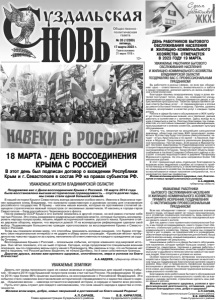Газета основана 21 марта 1918 г. № 20 (12389) пятница, 17 марта 2023 г. Общественно политическая газета 12+ УВАЖАЕМЫЕ РАБОТНИКИ БЫТОВОГО ОБСЛУЖИВАНИЯ НАСЕЛЕНИЯ И ЖИЛИЩНО-КОММУНАЛЬНОГО ХОЗЯЙСТВА ВЛАДИМИРСКОЙ ОБЛАСТИ! ПОЗДРАВЛЯЮ ВАС С ПРОФЕССИОНАЛЬНЫМ ПРАЗДНИКОМ! Вы работаете в разных сферах, но всех вас объединяет одно – ответственность, внимательность и забота о наших гражданах, желание сделать их жизнь комфортной и благополучной. Благодаря вашему каждодневному труду в дома жителей поступают тепло, вода, газ, освещаются улицы, ремонтируются дороги, благоустраиваются дворы и общественные пространства. Также вы предоставляете целый спектр бытовых услуг – от парикмахерских и ателье до ремонта бытовой техники и квартир. Причём, уровень сервиса, ассортимент и качество услуг с каждым годом растут. Работа в сфере бытового обслуживания и ЖКХ требует не только специальных знаний, но и терпения, умения работать в коллективе и с жителями. Здесь всегда есть куда стремиться и расти. Поэтому благодарю тех специалистов, кто постоянно повышает уровень квалификации, прислушивается к мнению клиентов, развивает культуру обслуживания. Отмечу, что, несмотря на мощнейшее санкционное давление, областная система ЖКХ продолжает развиваться. В этом году будут построены семь котельных: четыре – в Гусь-Хрустальном и по одной – в Лакинске, Киржаче и Муроме. Продолжается реализация федеральной программы «Чистая вода». В её рамках в Муроме будет построен водопровод по Радиозаводскому шоссе и станция повышения давления. Реконструируют центральный водозабор в Петушках. Также обновят объекты водоснабжения в посёлке Ставрово Собинского района и построят станцию водоподготовки в деревне Панфилово Муромского района. На эти цели направлено более 730 миллионов рублей. В этот праздничный день отдельную благодарность выражаю всем аварийным службам за готовность прийти на помощь в любую минуту, а также ветеранам жилищно-коммунального хозяйства. На вашем примере не только воспитываются новые поколения специалистов, но и укрепляется престиж профессии. Желаю всем вам крепкого здоровья, сил, благополучия и новых профессиональных успехов. А.А.АВДЕЕВ, губернатор области. УВАЖАЕМЫЕ ЖИТЕЛИ ВЛАДИМИРСКОЙ ОБЛАСТИ! Поздравляю вас с Днем воссоединения Крыма с Россией. 18 марта 2014 года была восстановлена высшая историческая справедливость – спустя долгие годы, мы снова стали одной большой семьёй. В нашей истории Крым и Севастополь всегда занимали особое место. Именно в Херсонесе принял крещение князь Владимир, что заложило нравственную и духовную основу для становления российского государства. В Крыму – могилы наших воинов, которые на протяжение столетий защищали стратегически важный полуостров от иноземных захватчиков. И наконец в городе-герое Севастополе – база российского Черноморского флота. После развала СССР Крым и его жители оказались в другой стране, но всё равно считали себя частью России. Это очень раздражало радикальные киевские власти, которые пытались ассимилировать народы полуострова, лишить людей исторической памяти, русского языка. Крымчане стойко держали оборону, верили, что вернутся домой. И на всенародном референдуме сделали свой выбор. Подавляющее большинство граждан проголосовало за воссоединение Крыма и Севастополя с Россией. Тогда мы пока