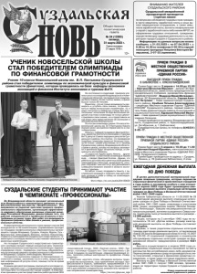 Газета основана 21 марта 1918 г. № 24 (12393) пятница, 31 марта 2023 г. Общественно политическая газета 12+ На состязания в олимпиаде приехали ученики школ и колледжей Владимирской и Нижегородской областей. На первый этап олимпиады было подано более тысячи заявок, в финал вышли только 85 человек. Финатлон - это не только возможность расширить и углубить свои знания, потренироваться перед выпускными экзаменами, но и шанс поступить в любой вуз страны без вступительных испытаний. В ходе выполнения заданий участники олимпиады не только демонстрировали свои знания, но и представили на суд жюри свои представления об экономике и экономической безопасности. По итогам олимпиады ученик 10 класса Новосельской школы им. В.П.Пантыкина Никита Акимов занял заслуженно первое место и стал победителем. Никиту с победой поздравил Дмитрий Козлов, директор Института экономики и туризма ВлГУ, депутат Совета народных депутатов Суздальского района. Он отметил, что проведение подобных олимпиад приносит большую пользу не только самим участникам, но и нашему Суздальскому району, Владимирской области, стране в целом, потому что вопросы экономики и финансов будут актуальны всегда, а специалисты востребованы. «С радостью будем ждать Никиту , других победителей и участников олимпиад в нашем вузе, - говорит Дмитрий Козлов.- Думаю, что ребята по достоинству оценят высокий уровень преподавания и большие возможности, которые открывает наш институт для дальнейшего совершенствования знаний в области экономики и туризма». Остается только поздравить Никиту с заслуженной наградой и пожелать ему дальнейших успехов в учебе и побед на олимпиадах. ПОЗДРАВЛЯЕМ! Фото https://vk.com/public204120600 ВЫЕЗДНОЙ ПРИЕМ ГРАЖДАН В БИБЛИОТЕКЕ п. КРАСНОГВАРДЕЙСКИЙ Прием будут вести: 3 апреля с 14.00 до 15.00 – Картухин Вячеслав Юрьевич - депутат ЗС Владимирской области, заместитель председателя Законодательного Собрания, руководитель фракции "ЕДИНАЯ РОССИЯ", Федоров Юрий Матвеевич - депутат ЗС Владимирской области, Сараев Алексей Петрович – Глава администрации Суздальского района, Срибная Татьяна Александровна - секретарь Местного отделения Партии "ЕДИНАЯ РОССИЯ" Суздальского района, первый заместитель Главы администрации района по внутренней и социальной политике, Курашкин Николай Иванович – глава администрации муниципального образования Селецкое. Прием проводится по адресу: Владимирская область, Суздальский район, п. Красногвардейский, ул. Октябрьская, д. 1 (библиотека) Предварительная запись по телефону 8(49231) 2-05-17. *** ПРИЕМ ГРАЖДАН В МЕСТНОЙ ОБЩЕСТВЕННОЙ ПРИЕМНОЙ ПАРТИИ «ЕДИНАЯ РОССИЯ» СУЗДАЛЬСКОГО РАЙОНА Прием будет вести 5 апреля с 10.00 до 11.00 – Савочкин Андрей Юрьевич, член политического совета Местного отделения Партии «ЕДИНАЯ РОССИЯ» Суздальского района. Прием будет проводиться по адресу: г. Суздаль, ул. Ленина, д. 78 (районная библиотека), 2 этаж. ПРИЕМ ГРАЖДАН В МЕСТНОЙ ОБЩЕСТВЕННОЙ ПРИЕМНОЙ ПАРТИИ «ЕДИНАЯ РОССИЯ» ЕЖЕГОДНАЯ ДЕНЕЖНАЯ ВЫПЛАТА КО ДНЮ ПОБЕДЫ В целях дополнительной материальной поддержки пожилым гражданам, которые перенесли серьезные физические и нравственные страдания в годы войны и заслужили особого к ним отношения в апреле 2023 года будет произведена ежегодная денежная выплата отдельным категориям граждан ко Дню Победы в Великой Отечественной войне 1941-1945 годов. Указом Губе