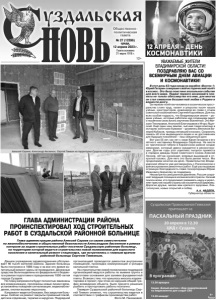 Газета основана 21 марта 1918 г. № 27 (12396) среда, 12 апреля 2023 г. Общественно политическая газета 12+ В этот день 62 года назад на корабле «Восток 1» Юрий Гагарин совершил свой исторический полёт в космос. Это было поистине эпохальное событие для всего мира. Подвиг первого космонавта планеты не только обессмертил его имя, для многих он стал символом беззаветной любви к Родине и верности долгу. За первым полётом человека в космическое пространство стоял труд, талант и упорство тысяч наших учёных, конструкторов, инженеров во главе с отцом советской космонавтики Сергеем Королёвым. Для нас всех особая гордость, что Владимирская земля – родина учёных, которые работали над созданием ракет и посвятили свою жизнь изучению Вселенной. Это Михаил Тихонравов, Анатолий Благонравов и Игорь Яцунский. Ещё один наш земляк, чьё имя также вписано в историю золотыми буквами – уроженец Вязников Валерий Кубасов, трижды летавший в космос. Сохранить память об этих выдающихся людях и их достижениях для будущих поколений – наш священный долг. Вот уже 55 лет, как нет с нами Юрия Гагарина и его лётного наставника Владимира Серёгина. На месте их трагической гибели в Киржачском районе создан мемориал, который давно нуждается в реконструкции. Долгие годы этот комплекс пытался привести в порядок дважды Герой Советского Союза Алексей Леонов, лётчик-космонавт, впервые вышедший в открытый космос. Для него это было делом чести. Мы продолжаем начатое им дело. Правительство Владимирской области уже договорилось с Роскосмосом о финансировании ремонтных работ. Ещё раз выражаю огромную благодарность главе госкорпорации Юрию Ивановичу Борисову за поддержку. Несмотря на санкционное давление, Россия сохраняет ведущие позиции в космической отрасли. Низкий поклон всем, кто продолжает развивать науку и укрепляет престиж нашей страны как космической державы. Дорогие друзья, желаю вам крепкого здоровья, благополучия, новых открытий и побед. А.А. АВДЕЕВ, Губернатор области. УВАЖАЕМЫЕ ЖИТЕЛИ ВЛАДИМИРСКОЙ ОБЛАСТИ! ПОЗДРАВЛЯЮ ВАС СО ВСЕМИРНЫМ ДНЕМ АВИАЦИИ И КОСМОНАВТИКИ! ГЛАВА АДМИНИСТРАЦИИ РАЙОНА ПРОИНСПЕКТИРОВАЛ ХОД СТРОИТЕЛЬНЫХ РАБОТ В СУЗДАЛЬСКОЙ РАЙОННОЙ БОЛЬНИЦЕ Данное учреждение здравоохранения обслуживает 46 тысяч жителей района. Здание больницы было построено в 1986 году и за все это время капитальный ремонт здесь не проводился. Денежные средства были выделены из федерального бюджета в рамках подготовки к празднованию 1000-летия города Суздаля. По плану капремонта будут полностью заменены все коммуникации, проложены новые линии связи, установлены пожарная сигнализация, видеонаблюдение, кнопки вызова персонала. Капремонт ведется блоками, без закрытия больницы. Сейчас на ремонт закрыты приемный покой, детское отделение, терапия и хирургия. Подрядной организацией проводится демонтаж внутренних помещений, прокладка коммуникаций и укладка напольной плитки. На строительстве новой поликлиники подрядной организацией ведутся работы по выемке грунта и подготовке основания для заливки фундаментной плиты. В связи с тем, что пришлось вносить корректировки в проект, при этом не нарушив общий график возведения объекта, было принято решение разбить и проторговать работы поэтапно. Главврач Суздальской районной больницы Сергей Тимкин отметил, что строительство ведется в со