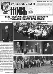 Газета основана 21 марта 1918 г. № 33 (12402) среда, 3 мая 2023 г. Общественно политическая газета 12+ В Дне призывника приняли участие юнармейцы из средних школ №1 и №2 г.Суздаля, Боголюбовской, Новосельской, Павловской, Порецкой, Садовой, Сокольской, Новоалександровской школ, студенты Суздальского индустриально-гуманитарного колледжа, а также призывники и их родители. Со словами приветствия к призывникам обратились Глава администрации Суздальского района А.П. Сараев, первый заместитель Главы администрации района по внутренней и социальной политике Т.А. Срибная, военный комиссар г. Суздаль и Суздальского района С.А. Можаев, член президиума Совета ветеранов войны и труда, Вооруженных Сил и правоохранительных органов Суздальского района Б.П. Мурашко, руководитель Суздальского отделения Всероссийской общественной организации ветеранов «Боевое братство» В.С. Шушанский, ветеран боевых действий, участник СВО А.В. Зиновьев, благочинный Суздальского района отец Георгий. Для участников мероприятия с концертной программой выступили артисты межпоселенческого методического культурно-досугового центра с.Новое и Центра культуры и досуга г.Суздаля. После официальной торжественной части ребята возложили цветы к Вечному огню - мемориалу суздальцам, погибшим в годы Великой Отечественной войны. День призывника в Суздальском районе прошел на высокой патриотической ноте. Александр СУРИКОВ. Фото К. Батюковой. БЫТЬ ГОТОВЫМИ К ВЫПОЛНЕНИЮ ВОИНСКОГО И ГРАЖДАНСКОГО ДОЛГА ПЕРЕД СТРАНОЙ 26 апреля на базе МБУК «Центр культуры и досуга» г.Суздаля прошел районный День призывника. С каждым годом повышается престиж воинской службы в глазах современной молодежи, становится более актуальным военно-патриотическое воспитание, формируется глубокое понимание воинского и гражданского долга перед своей страной. Призывников приветствует А.П. Сараев. Участники Дня призывника в Суздальском районе. Военный комиссар г. Суздаль и Суздальского района С.А. Можаев. Выступление артистов межпоселенческого методического культурно-досугового центра. Благочинный Суздальского района отец Георгий. Возложение цветов к Вечному огню. ЛИЧНЫЙ ПРИЕМ ГРАЖДАН Суздальским межрайонным прокурором ЧЕРНОВЫМ Андреем Александровичем и начальником ОСП Суздальского района УФССП России по Владимирской области ШМЕЛЕВОЙ Елизаветой Александровной 04.05.2023 с 11-00 до 13-00 в здании Суздальской межрайонной прокуратуры, расположенном по адресу: г. Суздаль, ул. Ленина, д. 65, 3 этаж будет проведен личный прием граждан. Возможна предварительная запись на прием по телефонам: 2-07-35, 2-50-02.