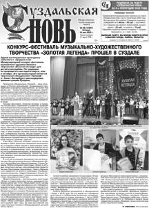 Газета основана 21 марта 1918 г. № 38 (12407) пятница, 19 мая 2023 г. Общественно политическая газета 12+ Творческое объединение «Триумф» – одна из ведущих в России организаций, занимающихся проведением культурных мероприятий: за более чем десять лет – более 50 детско-юношеских творческих конкурсов-фестивалей в России и за рубежом. Компания сотрудничает с ведущими деятелями искусства, которые помогают выявить молодые таланты на конкурсах и в дальнейшем способствовать их творческому развитию в лучших учебных заведениях мира. Конкурс-фестиваль «Золотая легенда» в Суздале способствует сохранению и развитию традиций многонациональной культуры России и других стран через всестороннюю поддержку талантливых детей и молодёжи в различных направлениях искусства. Особая миссия фестиваля – привлечение к творчеству воспитанников детских домов, детей с ограниченными физическими возможностями. Номинации, по которым происходит отбор юных дарований, очень разнообразны: танцевальное, вокальное, инструментальное, театральное творчество, цирковое искусство, молодые исполнители и барды. Фестиваль включает выставку изобразительного (живопись, графика), прикладного и фотоискусства, а также конкурс костюма (лучший национальный, сценический костюм, лучшая модель). В конкурсных отборах по разным направлениям и жанрам музыкально-художественного творчества участвуют юные таланты, начиная с трёх лет. Участники «Золотой легенды» смогли не только проявить себя в различных творческих испытаниях, но и получить новые знания и практические советы на творческих встречах и мастер-классах по народному и современному танцу, эстрадному вокалу, инструментальной музыке, актёрскому мастерству, декоративно-прикладному творчеству, которые проводят опытные мастера в разных направлениях искусства. В этот раз в конкурсе принимали участие воспитанники Центра дополнительного образования «Исток»: Никита Мальков, Мария Семенова, Степан Семенов. Ребята посещают изостудию «Этюд» и «Студию лоскутного шитья» под руководством педагога Оксаны Николаевны Винниченко. Никита Мальков стал лауреатом 3 степени в номинации «Изобразительное искусство», Мария Семенова и Степан Семенов стали лауреатами 1 степени в номинации «Выставка прикладного искусства». Мария Семенова - воспитанница изостудии «Этюд» и студии лоскутного шитья, занимается любимым делом уже 10 лет. Маша имеет много наград и достижений. Самые значимые из них: II Международный конкурс учебных и творческих эскизов и зарисовок с натуры «Осенняя палитра», победитель Международного конкурса «Природы вдохновение», 1 место в Международном детско-юношеском многожанровом фестивале-конкурсе «Белый кит», 1 место в Международном конкурсе-фестивале музыкально-художественного творчества «Золотая легенда». Маша стипендиат администрации Суздальского района 2021 года. За свои достижения она 5 раз получала путевки в Международный детский центр «Артек». КОНКУРС-ФЕСТИВАЛЬ МУЗЫКАЛЬНО-ХУДОЖЕСТВЕННОГО ТВОРЧЕСТВА «ЗОЛОТАЯ ЛЕГЕНДА» ПРОШЕЛ В СУЗДАЛЕ Одним из интересных культурных событий в г. Суздале стал Международный конкурс-фестиваль музыкально-художественного творчества «Золотая легенда» для детей и молодёжи. По традиции он проводится ежегодно в марте, мае и октябре. Его организатором является творческое объединение