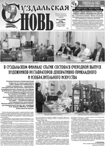 Газета основана 21 марта 1918 г. № 51 (12420) среда, 5 июля 2023 г. Общественно политическая газета 12+ В качестве дипломных работ студентами были представлены отреставрированные ими памятники искусства из музеев различных городов нашей страны: Углича, Вологды, Кузбасса, Егорьевска, с. Небылое Суздальского района. Нескрываемое восхищение присутствующих и сотрудников музея вызвали башенные часы из Угличского государственного историко-архитектурного и художественного музея. Собирая историко-искусствоведческую справку, студенты выяснили, что часы были установлены на колокольню Угличского Спасо-Преображенского собора в середине XVII века. К концу XIX века механизм башенных часов вышел из строя и технически устарел. Циферблаты, привод к колоколам и гиревые шахты были постепенно утрачены. Часы были переданы на реставрацию в Филиал два года назад. Реставрация была сложной, памятник имел в своей конструкции деревянные элементы, которые нужно было укрепить, и утраты на металлических деталях, которые нужно было восполнить. Главный хранитель музея О.Б. Шелепугина выразила слова глубокой благодарности и признательности всем, кто принимал участие в реставрации, а члены государственной экзаменационной комиссии отметили высокий профессиональный уровень реставрации памятника. Теперь механизм башенных часов будет передан В СПбГИК идет защита дипломных работ. Государственная экзаменационная комиссия. Диплом торжественно вручает директор Суздальского филиала СПбГИК М.П. Виткина. Одна из дипломных работ - отреставрированные башенные часы из Угличского музея. В СУЗДАЛЬСКОМ ФИЛИАЛЕ СПбГИК СОСТОЯЛСЯ ОЧЕРЕДНОЙ ВЫПУСК ХУДОЖНИКОВ-РЕСТАВРАТОРОВ ДЕКОРАТИВНО-ПРИКЛАДНОГО И ИЗОБРАЗИТЕЛЬНОГО ИСКУССТВА Государственную экзаменационную комиссию по защите дипломных работ крайне востребованных в стране специалистов – художниковреставраторов декоративно-прикладного и изобразительного искусства возглавлял Д.Б.Антонов, директор Государственного научно-исследовательского института реставрации (ГосНИИР). Членами комиссии традиционно являлись высокопрофессиональные специалисты в области реставрации культурного наследия – сотрудники ведущих реставрационных организаций: Всероссийского художественного научнореставрационного центра им. академика И.Э. Грабаря (ВХНРЦ), ГосНИИР, представители музеев. для экспозиции в музей и займет почетное место на праздновании дня города Углича, который состоится 15 июля 2023 года. Члены ГЭК отметили также сложную реставрацию книг XVIII - XIX в.в из собрания Кирилло-Белозерского историко- архитектурного и художественного музея-заповедника и оценили работу всех выпускников на «отлично». Кстати, это первый выпуск преподавателя по реставрации книги Биткова А.Р., бывшего выпускника Суздальского художественно-реставрационного училища. Интересные работы были и у студентов на специализации «Реставрация, консервация произведений ДПИ музейного металла»: реставрация керосинки двухфитильной однотрубной начала XX века, реставрация тесака пехотного и тесака саперного солдатского образца 1797-1822 гг., реставрация сабли легкокавалерийской образца 1809 г. и др. Суздальский филиал СПбГИК давно и плодотворно работает с монастырем из с. Небылое Суздальского района, получая на реставрацию храмовые предметы. Благодаря этому сотруднич