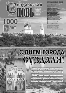 Газета основана 21 марта 1918 г. № 62 (12431) пятница, 11 августа 2023 г. Общественно политическая газета 12+ № 62 (12431) пятница, 11 августа 2023 г. Газета основана 21 марта 1918 г. Общественно политическая газета С ДНЕМ ГОРОДА СУЗДАЛЯ! 1000 лет СУЗДАЛЬСКАЯ РУСЬ Какая красота, Целительный покой И духа высота Над Каменкой-рекой. Руками я взмахну, Взлететь чтоб и обнять Святую старину И эту благодать. И песнею зальюсь, Как жаворонок я: О, Суздальская Русь – Священные края! Сошлись, как на парад, Церквушки над рекой. Мой вечный Суздаль-град, Я вечный житель твой. Руками я взмахну, Взлететь чтоб и объять Родимую страну, Всю эту благодать. Я соколом взовьюсь С былинного герба, О, Суздальская Русь – Священная судьба. Анатолий ЕВСЕЕНКО. Суздаль - один из древнейших городов нашей страны, город-музей. Впервые он упоминается в летописи в XI веке. Годом его основания считается - 1024. По молитвам 14 суздальских святых стоит Богоспасаемый город Суздаль. Суздаль - славная страница истории Российского государства. Впереди город ждут грандиозные преобразования и реализация уникальных проектов к 1000-летнему юбилею, которые, несомненно, преумножат очарование Суздаля и помогут удивить многочисленных гостей и туристов. Фото М. Пахомовой. 12+