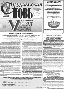 Газета основана 21 марта 1918 г. № 65 (12434) среда, 23 августа 2023 г. Общественно политическая газета 12+ СКОРО!СКОРО! Открытие фирменного магазина «ПАВЛОВСКАЯ КУРОЧКА» в Суздале! Приглашаем на работу: управляющего магазином, зарплата от 38000 рублей; продавца-кассира, зарплата от 30000 рублей. Сменный график, работа рядом с домом. Звоните 8 930 286 82 81 ШИРОКИЙ АССОРТИМЕНТ ПРОДУКТОВ Наш адрес: г. Суздаль, бульвар Всполье, 15 А Р е к л а м а Согласно законодательству о выборах сотрудники ОМВД России по Суздальскому району будут осуществлять охрану избирательных участков, а в дни голосования (усиленными нарядами) контролировать на них законность и правопорядок. В связи с этим напоминаю, что Кодекс Российской Федерации об административных правонарушениях (далее КоАП РФ) содержит ряд статей, предусматривающих ответственность за посягательства на общественные отношения, связанные с процессом выборов. В частности, наказывается: проведение предвыборной агитации, агитации по вопросам референдума вне агитационного периода и в местах, где ее проведение запрещено законодательством о выборах и референдумах (ст. 5.10 КоАП РФ); проведение предвыборной агитации, агитации по вопросам референдума лицами, которым участие в ее проведении запрещено федеральным законом (ст. 5.11 КоАП РФ); изготовление, распространение или размещение агитационных материалов с нарушением требований законодательства о выборах и референдумах (ст. 5.12 КоАП РФ); умышленное уничтожение или повреждение печатных материалов, относящихся к выборам, референдуму (ст. 5.14 КоАП РФ); привлечение к проведению предвыборной агитации лиц, которые не достигнут на день голосования возраста 18 лет; проведение агитации в формах и методами, которые запрещены федеральным законом. Уместно напомнить, что запрещёнными формами и методами агитации считаются: • изготовление, распространение или размещение агитационных материалов с нарушением требований законодательства о выборах и референдумах; • умышленное уничтожение или повреждение печатных материалов, относящихся к выборам, референдуму; • подкуп избирателей, участников референдума либо осуществление в период избирательной кампании, кампании референдума благотворительной деятельности с нарушением законодательства о выборах и референдумах; • нарушение запрета на проведение в период избирательной кампании, кампании референдума лотерей и других, основанных на риске игр, связанных с выборами и референдумом; • производство и распространение экстремистских материалов. Напоминаю, что помимо наказания за нарушение действующего выборного законодательства, установленного КоАП РФ, граждане так же могут быть привлечены к ответственности и за нарушения общественного порядка на избирательных участках и непосредственно около них. К таким нарушениям относятся появление в пьяном виде, различные хулиганские действия, нецензурная брань. Помните, что указанные действия, идущие в разрез с требованиями законодательства, влекут наложение административного штрафа или обязательные работы, а так же административный арест. Сегодня все мы живём в сложное, напряжённое время. О террористических актах и их попытках многие граждане уже знают не понаслышке. Нужно помнить, что места скопления людей (а избирательные участки в полной мере относятся к таковым) представля