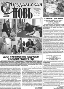 Газета основана 21 марта 1918 г. № 68 (12437) пятница, 1 сентября 2023 г. Общественно политическая газета 12+ После летних каникул радостные голоса детей вновь звучат в наших учебных заведениях. В этом году в регионе впервые сели за парты более 15700 первоклассников. Ребята, сейчас вы в самом начале увлекательного пути, впереди – новые знания, открытия и друзья. Мы живём в век информационных технологий, прогресса, и только качественное образование и наука позволяют нам оставаться конкурентоспособными. Жажда знаний, расширение кругозора, трудолюбие – это не только фундамент для будущего каждого человека, но и развития общества в целом. Дорогие учащиеся, желаем вам яркого и увлекательного учебного года, интересных открытий и позитивных эмоций. Пусть 1 сентября станет отправной точкой для новых свершений и побед. Отдельные слова сегодня, конечно, учителям. 2023 год – особенный для отечественной системы образования. Президент России Владимир Путин объявил его Годом педагога и наставника. Вы не только дарите детям знания, но и помогаете преодолевать сложности, поддерживаете и вдохновляете. Ваша верность профессии, терпение, чуткость формируют будущих лидеров и специалистов Владимирской области. Отметим, что образование – это то, что делает нас сильными, готовыми к переменам и вызовам. Оно открывает перед нами мир возможностей, помогает найти своё место в жизни и достигать успеха. Создание самой современной инфраструктуры, укомплектованность кадрами и качественное образование всем детям – одни из главных задач регионального Правительства. Сейчас в области строятся восемь новых школ. Начато возведение ещё двух – в микрорайоне Сновицы-Веризино Владимира и в Суздале. Также в 2025-2026 годах планируем построить новую школу в Александрове на 1100 мест. В этом году у нас большие планы по капитальному ремонту. Дорогие друзья, пусть знания, полученные в учебных стенах, откроют перед вами любые двери. Желаем вам постоянного развития и стремления к новым высотам. Правительство Владимирской области. 1 СЕНТЯБРЯ - ДЕНЬ ЗНАНИЙ ДОРОГИЕ ПЕРВОКЛАССНИКИ, УЧАЩИЕСЯ, СТУДЕНТЫ И ИХ РОДИТЕЛИ! Примите сердечные поздравления с Днем знаний и самые добрые пожелания в связи с началом нового учебного года! Первое сентября – праздник, близкий каждому из нас. В этот день все мы с теплотой и любовью вспоминаем свой первый звонок, первого учителя и школьных друзей. Впереди прекрасное время покорения знаний и достижения побед! И если самым младшим школьникам только предстоит освоить учебные навыки, то для старшеклассников и выпускников наступающий учебный год станет определяющим в выборе профессии. Со своей стороны, мы, взрослые, делаем всё, чтобы вам было комфортно и интересно учиться, чтобы вы смогли получить качественное образование и найти своё призвание в жизни. По инициативе Президента России Владимира Путина реализуется национальный проект «Образование». В учебные заведения закупается современное оборудование, создаются центры дополнительного образования и строятся новые школы. В мае текущего года начато строительство школы на 1200 мест в Суздале - это особый проект, посвященный грядущему юбилею города. А сегодня свои двери для учеников распахнет новая начальная школа в с. Сновицы. Но, конечно же, главное в системе образования — это люди! Преданные своему делу педаг