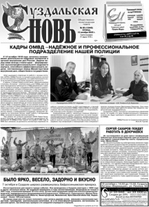 Газета основана 21 марта 1918 г. № 80 (12449) пятница, 13 октября 2023 г. Общественно политическая газета 12+ Штат нынешнего отделения по работе с личным составом (ОРЛС) ОМВД России по Суздальскому району состоит из 4 аттестованных сотрудников, но в действительности изза естественной ротации имеет вакантные должности. А задачи, стоящие перед коллективом, довольно широки и значимы. Основная – комплектовать штат ОМВД. Для этой цели периодически публикуются в СМИ объявления о приёме на службу в полицию, сотрудники ОРЛС бывают в различных учреждениях, активно сотрудничают с местным военкоматом и службой занятости, проводят в учебных заведениях профориентационные беседы… Желающие связать свою судьбу с МВД направляются на полугодовую учёбу в Центр профподготовки УМВД России по Владимирской области. А из числа уже начавших службу в ОМВД кадровики отбирают кандидатов на обучение (заочное) в вузы системы МВД. Заканчивающим школы и средние специальные учебные заведения делается предложение об очном продолжении учёбы в вузах МВД. Сотрудники ОРЛС на постоянной основе проводят с личным составом ОМВД занятия по физической и огневой подготовке. А ещё это подразделение издаёт приказы о принятии на службу, о награждении, о присвоении специальных званий, о командировке сотрудника, оформляет документы на получение пенсии, ведёт работу с ветеранами МВД, занимается ведомственным музеем. Уже немало лет успешно руководит ОРЛС Павел Геннадьевич Королев, который имеет высшее юридическое образование. В ОМВД он был принят на службу в 1992 году. В 2004 был назначен на должность инспектора отделения по КАДРЫ ОМВД –НАДЁЖНОЕ И ПРОФЕССИОНАЛЬНОЕ ПОДРАЗДЕЛЕНИЕ НАШЕЙ ПОЛИЦИИ С 12 октября 1918 года началось налаживание деятельности кадровых аппаратов в органах внутренних дел России. Задачи перед ними всегда стояли одни – формирование высокопрофессионального кадрового корпуса, способного эффективно решать задачи, поставленные перед Министерством внутренних дел, обществом и государством. работе с личным составом, а в 2011 возглавил его, став ещё и помощником начальника ОМВД. Работу ОРЛС он наладил отменно. На счету подполковника полиции П.Г. Королева более полутора сотен наград и поощрений! Каждодневную работу, связанную главным образом с оформлением самых разных документов (по всем направлениям деятельности ОРЛС), аккуратно, профессионально и весьма оперативно проводят специалист по воспитательной работе капитан полиции службы Анна Васильевна Голева. С недавних пор напарницей и помощницей стала специалист капитан полиции Ксения Дмитриевна Баранова. Они очень хорошо дополняют друг друга и в связке, как говорится, трудятся весьма производительно. Сотрудники ОРЛС пользуются заслуженным уважением коллег по службе. И в день профессионального праздника, конечно же, будут принимать поздравления личного состава ОМВД. ОМВД России по Суздальскому району. Фото В. Сухова. Руководитель ОРЛС П.Г. Королев. Капитаны полиции - А.В. Голева и К.Д. Баранова. БЫЛО ЯРКО, ВЕСЕЛО, ЗАДОРНО И ВКУСНО Это историческое для нашего города событие. Она проводилась в Суздале ежегодно с 1853 года и «жила» несколько веков. Но традиция прервалась в годы коллективизации. Возродили ее только в 2007 году, и нынешняя ярмарка 16-я по счету. На нее свою продукцию привезли сельхозтоваропроизводители, индиви