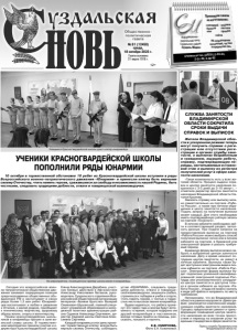 Газета основана 21 марта 1918 г. № 81 (12450) среда, 18 октября 2023 г. Общественно политическая газета 12+ Сегодня это всероссийское военно-патриотическое общественное движение занимает лидирующие позиции среди молодежных общественных объединений РФ и насчитывает в своих рядах более 1,3 млн ребят. Юнармейцев воспитывают в любви и уважении к Отчизне, к малой родине, приобщают к техническому творчеству, здоровому образу жизни, спорту и волонтерству. Прием красногвардейских школьников в юнармейцы прошел в зале воинской славы школы. В торжественном мероприятии приняли участие и.о. директора Красногвардейской школы Елена Александровна Дерябина, участник боевых действий в Афганистане Александр Николаевич Баташов, руководитель Суздальского отделения Всероссийской общественной организации ветеранов «Боевое братство» Валерий Семенович Шушанский, главный специалист управления образования и молодежной политики администрации района Суриков Александр Сергеевич, директор Садовой школы Светлана Алексеевна Сергеева. Каждый юнармеец в этот день произнес торжественную клятву: всегда быть верным своему Отечеству, соблюдать устав «ЮНАРМИИ», следовать традициям доблести, отваги и товарищеской взаимовыручки, защищать слабых, стремиться к победам в учебе и спорте, чтить память героев, с честью и гордостью нести высокое звание юнармейца. Будем надеяться, что ребята пронесут это через года и всегда будут вспоминать то время, которое подарило им друзей-юнармейцев и наставников, всегда готовых прийти на помощь, рассказать, показать и научить. Е.В. СМИРНОВА. Фото Е.А. Кожиновой. УЧЕНИКИ КРАСНОГВАРДЕЙСКОЙ ШКОЛЫ ПОПОЛНИЛИ РЯДЫ ЮНАРМИИ 10 октября в торжественной обстановке 10 ребят из Красногвардейской школы вступили в ряды Всероссийского военно-патриотического движения «Юнармия» и принесли клятву быть верными своему Отечеству, чтить память героев, сражавшихся за свободу и независимость нашей Родины, быть честными, следовать традициям доблести, отваги и товарищеской взаимовыручки. Принимаем заказы на изготовление: PR-сопровождение организаций, частных и юридических лиц. Справки по тел. (49231) 2-03-34, 2 01 39, 2 08 95 Информационноиздательский центр Суздальского района «Суздаль-Медиа» Информационно календарей буклетов книг альбомов листовок флаеров сайтов Реклама СЛУЖБА ЗАНЯТОСТИ ВЛАДИМИРСКОЙ ОБЛАСТИ СОКРАТИЛА СРОКИ ВЫДАЧИ СПРАВОК И ВЫПИСОК Жители Владимирской области в ускоренном режиме теперь могут получить справки о регистрации или отсутствии регистрации в органах службы занятости, о выплатах безработным и гражданам, ищущим работу, справку, подтверждающую периоды, засчитываемые в страховой стаж и выписку из регистра получателей услуг в сфере занятости населения. «Такая возможность есть у всех жителей области. Процесс выдачи справок в центре занятости населения сократился с 3-5 дней до 5-10 минут», – отметила директор Центра занятости населения Владимирской области Наталья Крылова. Заказать справку или выписку можно самостоятельно на портале «Работа России», а также при личном обращении в центр занятости населения. Подать запрос на получение выписки может каждый. Для этого необходимо иметь подтверждённую учётную запись на портале «Госуслуги». В личном кабинете необходимо зайти в соответствующий раздел, заполнить данные. При подаче запроса на 
