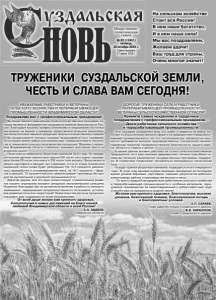 общественноO политическая газета УЗДАЛЬСКАЯ 4 № 82 (12451) пятница, 20 октября 2023 г. СЕЛЬСКОЕ ХОЗЯЙСТВО Главой администрации Суздальского района было издано постановление о награждении победителей конкурса «Лучший по профессии» среди сельскохозяйственных предприятий Суздальского района по итогам работы за 2023 год. Руководствуясь условиями проведения конкурса «Лучший по профессии» в сельскохозяйственных предприятиях Суздальского района в 2023 году, утвержденными постановлением администрации Суздальского района от 12.09.2023 № 2373, и в соответствии с протоколом заседания районной комиссии по подведению итогов конкурса от 13.10.2023 г. Глава администрации Суздальского района А.П. Сараев постановил: признать победителем конкурса «Лучший по профессии» в сельскохозяйственных предприятиях Суздальского района в 2023 году»: • среди водителей – Агрикова Евгения Геннадьевича, сельскохозяйственный производственный кооператив «Гавриловское»; • среди механизаторов – Максимова Александра Васильевича, акционерное общество «Агрофирма «Суздальские Зори»; • среди комбайнеров на заготовке кормов – Новожилова Алексея Сергеевича, акционерное общество «Суворовское»; • среди комбайнеров на зерноуборочных комбайнах - Тростина Александра Михайловича, сельскохозяйственный производственный кооператив «Спасское»; • среди операторов по выращиванию молодняка крупного рогатого скота – Родионову Марию Васильевну, общество с ограниченной ответственностью «Стародворский»; • среди операторов машинного доения – Семенову Ольгу Ивановну, сельскохозяйственный производственный кооператив «Гавриловское»; • среди операторов по искусственному осеменению коров и телок – Царева Ивана Анатольевича, общество с ограниченной ответственностью «Племзавод «Нива»; • среди работников молочного производства - Артамонова Алика Ивановича, оператора автоматической линии производства молочных продуктов общества с ограниченной ответственностью «Суздальский молочный завод». Победители конкурса «Лучший по профессии» будут награждены Почетной грамотой и ценным подарком. ЛУЧШИЕ ПО ПРОФЕССИИ Поздравляем! СВОИХ НЕ БРОСАЮТ! Сейчас очень непростое для нашей страны время - идет специальная военная операция. Сегодня тех, кто уходит защищать нашу Родину, поддерживает вся страна. Лозунг «Все для Победы!» наполняется сейчас особым смыслом. К акции помощи нашим солдатам присоединились практически все предприятия АПК Суздальского района. Так АО «Агрофирма «Суздальские Зори» отправила две автомашины: Волга-ГаЗ 31105 и ВАЗ -32107. АО «Суворовское» - автомобиль УАЗ и почти 400 кг мяса. В фонд помощи СВО, который был создан в Суздальском районе, были сделаны перечисления на укрепление материально-технической базы предприятиями района: АО «Мордыш», ООО «Племзавод «17 МЮД», ООО «Рассвет», ООО «Племзавод «Нива», СПК «Новосельский», СПК «Гавриловское», СПК «Спасское», ООО «СтародворПредприятия АПК Суздальского района оказывают помощь бойцам СВО Выставка традиционно представила достижения агропромышленного комплекса, в том числе технологического и научного обеспечения. Лучшие породы животных, крупнейшие инвестиционные проекты в регионах, разработки в области повышения плодородия почв, финансовые продукты для агробизнеса - все это и многое другое можно было увидеть в выставо