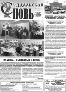 Газета основана 21 марта 1918 г. № 84 (12453) пятница, 27 октября 2023 г. Общественно политическая газета 12+ ПРИЕМ ГРАЖДАН В МЕСТНОЙ ОБЩЕСТВЕННОЙ ПРИЕМНОЙ ПАРТИИ «ЕДИНАЯ РОССИЯ» СУЗДАЛЬСКОГО РАЙОНА Прием будет вести: 1 ноября с 10.00 до 11.00 – САВОЧКИН Андрей Юрьевич, член политического совета местного отделения Партии «ЕДИНАЯ РОССИЯ» Суздальского района. Прием будет проводиться по адресу: г. Суздаль, ул. Ленина, д. 78 (районная библиотека), 2 этаж. Учащиеся школ Суздальского района и города Суздаля продолжают собирать посылки для участников специальной военной операции. И делают это не по рекомендациям взрослых, а по велению души. Ученики Новосельской средней школы имени В.П. Пантыкина передали бойцам 98-й гвардейской воздушно-десантной дивизии теплую одежду, продукты питания и рисунки. А еще школьники делают заготовки для маскировочных сетей, которые затем отправят в зону спецоперации. Учащиеся Весьской школы собрали посылки, написали письма, нарисовали рисунки для военных, находящихся в зоне проведения СВО. В своих посланиях ребята благодарят за мужество, смелость и верность Отечеству и очень хотят своими искренними, добрыми посланиями поддержать и согреть сердца бойцов. Осенью прошлого года из села Весь был мобилизован Александр Швайбович, вместе с ним отправился служить и сын педагога Весьской школы Дмитрий Дорожкин. Недавно пошёл добровольцем на фронт Валерий Посадский. Дмитрий в отпуске посетил школу, трудно описать словами с какой радостью дети встретили бойца. Ученики и сотрудники школ Суздальского района благодарят за службу и защиту нашей Родины бойцов СВО, желают им крепкого здоровья, силы духа, Победы и благополучного возвращения домой. Г.КИРИЛЛОВА. Фото предоставлены Новосельской и Весьской школами. Поздравляю вас с профессиональным праздником – Днём автомобилиста! Надёжное и безопасное автомобильное сообщение является неотъемлемой частью нашей жизни, и оно немыслимо без вашей слаженной и добросовестной работы. Ежегодно вы перевозите около 100 миллионов пассажиров. Сегодня вместе с вами мы идём по пути масштабных преобразований. Планомерно заменяем подвижной состав в городах, совершенствуем транспортную инфраструктуру и логистику. В прошлом году для 10 муниципалитетов закупили 57 единиц пассажирского транспорта. В этом году – уже 190. В том числе 100 новых автобусов для областной столицы. На линии выходят современные и качественные машины. Важно не только обеспечить безопасность пассажиров, но и бесперебойность движения. Уверен, что совместными усилиями сделаем движение на дорогах безопаснее, наладим эффективную работу системы общественного транспорта во всех территориях региона. Спасибо всем, кто ежедневно несёт за рулём рабочую вахту, кто обеспечивает выход транспорта на линию, кто помогает людям добираться в нужное место в нужное время, кто вносит личный вклад в развитие автомобильной отрасли. Особые слова благодарности – водителям правоохранительных органов и экстренных служб. Вместе с вашими коллегами вы спасаете жизни, оказываете помощь и поддержку в самые трудные моменты. Дорогие друзья, пусть каждая поездка будет приятной, а автомобили – надёжными. Искренне желаю вам крепкого здоровья и благополучия! А.А. АВДЕЕВ, Губернатор области. От имени администрации и Совета народных депутатов Суздальского района 