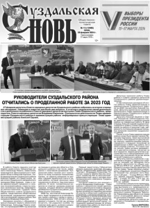 Газета основана 21 марта 1918 г. № 15 (12486) среда, 28 февраля 2024 г. Общественно политическая газета 12+ РУКОВОДИТЕЛИ СУЗДАЛЬСКОГО РАЙОНА ОТЧИТАЛИСЬ О ПРОДЕЛАННОЙ РАБОТЕ ЗА 2023 ГОД В работе Совета приняли участие первый заместитель Губернатора области Александр Ремига, заместитель председателя Законодательного Собрания области Вячеслав Картухин, Глава администрации Суздальского района Алексей Сараев, его заместители, заместитель Суздальского межрайонного прокурора Марк Кравцов, главы и главы администраций городского и сельских поселений района, старосты сельских населенных пунктов, председатели уличных комитетов г. Суздаля, члены Общественного совета Суздальского района, представители общественных организаций, руководители предприятий и организаций города и района. Вел заседание Владимир Кириллов. Заседание началось с обращения к присутствующим первого заместителя Губернатора. Александр Ремига отметил, что прошедший 2023 год несмотря на санкции в целом для области и Суздальского района в том числе, завершился с позитивной динамикой. Суздальский район показал рост практически по всем основным показателям. Однако, он обратил внимание на уровень средней заработной платы в нашем районе, который несколько ниже показателя по области. Над этим нужно работать. В числе положительных моментов он отметил динамику развития туризма, который является ключевым драйвером в Суздальском районе, рост инвестиций в экономику. 2024 год , как отметил Александр Ремига, будет проверкой на устойчивость для нашего района и города в связи с празднованием 1000-летнего юбилея древнего Суздаля. Гостей мы должны встретить, как радушные хозяева. Он пожелал всем удачи, успехов и результативной работы в текущем году. Первый заместитель Губернатора области выполнил приятную миссию и вручил генеральному директору ООО «Рассвет» Владимиру Кириллову Почетную грамоту Министерства сельского хозяйства РФ за многолетний , добросовестный труд в системе агропромышленного комплекса Суздальского района. Основная повестка дня началась с отчета Владимира Кириллова - Главы района о результатах своей деятельности и деятельности Совета народных депутатов Суздальского района. В своем выступлении он подробно рассказал об участии в областных и районных мероприятиях, о решении вопросов, которые находятся в исключительной компетенции Совета народных депутатов, о работе с наказами избирателей. Он поблагодарил депутатский корпус, сотрудников администрации за успешную совместную работу на благо жителей Суздальского района. 27 февраля депутаты Совета народных депутатов Суздальского района собрались на второе очередное заседание. Главными в повестке дня были два вопроса. С отчетом о результатах своей деятельности и деятельности районного Совета народных депутатов выступил Глава Суздальского района, председатель Совета народных депутатов Владимир Кириллов. О результатах деятельности Главы администрации Суздальского района и администрации района информировал присутствующих Глава администрации района Алексей Сараев. Депутаты признали работу Главы района и Совета народных депутатов Суздальского района удовлетворительной. С обстоятельным докладом об итогах работы Главы администрации и администрации Суздальского района за 2023 год выступил Алексей Сараев. Деп
