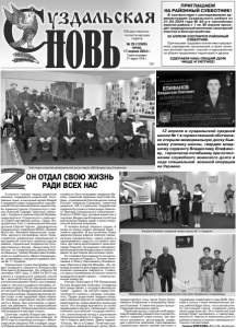 Газета основана 21 марта 1918 г. № 29 (12500) среда, 17 апреля 2024 г. Общественно политическая газета 12+ Склонить головы перед подвигом земляка, поддержать родителей, потерявших сына, в школьный музей боевой и трудовой славы суздальцев в годы Великой Отечественной войны пришли Глава администрации Суздальского района Алексей Сараев, военный комиссар г. Суздаля и района Сергей Можаев, председатель Суздальского районного Совета ветеранов войны, труда, Вооруженных Сил и правоохранительных органов Сергей Чуркин, руководитель Суздальского отделения ВООО «Боевое братство» Валерий Шушанский, родители, друзья и сослуживцы героя, представители управления образования и молодежной политики администрации района, социальный координатор Государственного фонда «Защитники Отечества» по Суздальскому району Юлиана Иванина, тренер Владислава Епифанова по кикбоксингу Феруз Карамхудоев, юнармейцы, учащиеся средней школы № 1 г. Суздаля. Лаконичные строки биографии гвардии младшего сержанта Владислава Олеговича Епифанова. Он родился 24 сентября 1997 года. С 2004 по 2013 год учился в суздальской средней школе № 1, окончил 9 классов. Одноклассники и учителя вспоминают Олега, как справедливого, честного и доброго человека, отзывчивого друга. После окончания школы он поступил во Владимирский авиамеханический колледж. Владислав всегда любил спорт и вел здоровый образ жизни. Он посещал спортивные секции кикбоксинга и бокса, был участником и призером, как районных, так и всероссийских соревнований. Успешно выполнил норматив кандидата в мастера спорта. Срочную службу Владислав проходил в воздушно-десантных войсках. В 2018 году он подписал контракт с Министерством обороны РФ и выбрал защиту Родины делом своей жизни. За период службы он был награжден: медалью Жукова, памятной медалью Анатолий Лебедь, учрежденной Союзом десантников России, медалью Суворова, памятной медалью «45-я отдельная гвардейская орденов Кутузова и Александра Невского бригада специального назначения». 9 августа 2023 года, проявив мужество и героизм, Владислав Епифанов погиб при выполнении боевых задач в зоне специальной военной операции. О потерях всегда говорить трудно. А когда из жизни уходят молодые люди – тяжело вдвойне. В выступлении Главы администрации района Алексея Сараева была отражена боль, горечь утраты и одновременно гордость за нашего земляка, достойно выполнившего свой долг перед Родиной. Он выразил соболезнование родителям Владислава и поблагодарил за достойное воспитание героя. Со словами благодарности за воспитание патриота Родины к Татьяне Николаевне и Олегу Николаевичу Епифановым обратился Сергей Можаев. «Он навсегда останется для подрастающего поколения примером твердости, стойкости духа и проявления истинных качеств гражданина своей страны», - отметил военный комиссар. Указом Президента РФ Владимира Путина Владислав Олегович Епифанов был представлен к государственной награде – ордену «За заслуги перед Отечеством IV степени с мечами» (посмертно). Орден родителям гвардии младшего сержанта вручил на торжественном мероприятии представитель воинской части. Эта награда вручается за особо выдающиеся заслуги, связанные с укреплением российской государственности, значительный вклад в укрепление обороноспособности страны, за отличия в боевых действиях. Девиз ор