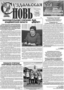 Газета основана 21 марта 1918 г. № 30 (12501) пятница, 19 апреля 2024 г. Общественно политическая газета 12+ УВАЖАЕМЫЕ РАБОТНИКИ И ВЕТЕРАНЫ ОРГАНОВ МЕСТНОГО САМОУПРАВЛЕНИЯ ВЛАДИМИРСКОЙ ОБЛАСТИ! Поздравляю вас с профессиональным праздником! Именно на местном уровне решаются самые насущные вопросы, от которых напрямую зависит качество жизни земляков. Главы муниципалитетов, работники администраций, депутаты районных советов, сельские старосты – ближе всех к людям. Вместе с вами мы стремимся сделать регион не только привлекательным для инвесторов и туристов, но и для жителей: благоустраиваем общественные пространства, улучшаем транспортную доступность сёл и деревень, строим спортивные и социальные объекты. Правительство области стремится сделать систему местного самоуправления максимально эффективной. В этом году она претерпит значительные изменения, о которых в том числе просили и сами жители. Так, ряд муниципальных районов будут преобразованы в муниципальные округа. «Пилотными» территориями станут Меленковский и Собинский районы. При этом в состав округа Муром войдут Борисоглебское и Ковардицкое поселения. Отмечу, что главная цель реформы – ускорение социально-экономического развития территорий и повышение уровня жизни людей. Местное самоуправление – это ещё и основа гражданского общества. В этом году прошли выборы Президента России. Ещё раз благодарю всех, кто пришёл на избирательные участки. Желаю вам крепкого здоровья, благополучия и новых достижений. А.А.АВДЕЕВ, Губернатор области. УВАЖАЕМЫЕ ДЕПУТАТЫ, МУНИЦИПАЛЬНЫЕ СЛУЖАЩИЕ, ВЕТЕРАНЫ МУНИЦИПАЛЬНОЙ СЛУЖБЫ И РАБОТНИКИ ОРГАНОВ МЕСТНОГО САМОУПРАВЛЕНИЯ СУЗДАЛЬСКОГО РАЙОНА! Примите искренние поздравления с государственным праздником – Днем местного самоуправления! Местное самоуправление по праву считается фундаментом развития территорий. На муниципальных служащих лежит серьезная ответственность за эффективное и гармоничное социально-экономическое развитие своих территорий, за создание комфортных условий проживания и обеспечение благополучия жителей. Со своими проблемами, идеями, замечаниями и предложениями жители в первую очередь обращаются в органы местного самоуправления. Вы решаете большое количество вопросов на своих территориях: от благоустройства и ЖКХ до вопросов культуры и спорта. Решение таких разных вопросов требует широкого спектра знаний, профессионализма, ответственности и умения работать в команде. Только вместе можно найти наиболее грамотный и взвешенный подход в решении поставленных задач. В этот праздничный день позвольте выразить признательность всем работникам органов местного самоуправления и депутатского корпуса за профессионализм, преданность делу, ответственность и самоотдачу. Особые слова благодарности хочется сказать ветеранам, которые в разные годы внесли свой вклад в развитие местного самоуправления Суздальского района. В этот праздничный день желаем вам и вашим близким здоровья и благополучия! Пусть все, что запланировано, обязательно воплотится в жизнь! А.П. САРАЕВ, Глава администрации Суздальского района. В.В. КИРИЛЛОВ, Глава Суздальского района. 19 апреля состоится торжественное мероприятие, посвященное 30-летию Законодательного Собрания. К предстоящему юбилею была приурочена пресс-конференция спикера облпарламен
