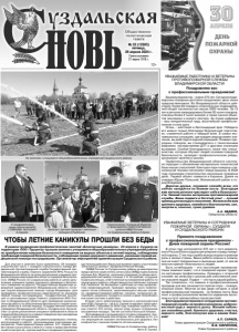 Газета основана 21 марта 1918 г. № 32 (12503) пятница, 26 апреля 2024 г. Общественно политическая газета 12+ УВАЖАЕМЫЕ РАБОТНИКИ И ВЕТЕРАНЫ ПРОТИВОПОЖАРНОЙ СЛУЖБЫ ВЛАДИМИРСКОЙ ОБЛАСТИ! Поздравляю вас с профессиональным праздником! Вашему ведомству – ровно 375 лет. Сегодня владимирские пожарные достойно продолжают дело своих предшественников. Во Владимирской области действуют более 60 пожарно-спасательных подразделений общей численностью свыше 2500 человек. За 15 лет в регионе ликвидировано более 30 тысяч пожаров, спасены более 4 тысяч жизней, а также тысячи объектов экономики и жилого сектора. За этими цифрами – ваш изнурительный труд, высочайший профессионализм и сила духа. Огонь – жестокий и беспощадный враг. Победить его можно только благодаря безупречной подготовке, слаженной работе и твёрдой воле. В самых экстремальных ситуациях, где каждая секунда имеет значение, вы действуете единой командой. Помимо природных пожаров, вы сталкиваетесь с техногенными авариями, последствиями ДТП и другими сложными вызовами. Особая благодарность также тем специалистам, которые обучают людей основам пожарной безопасности, проводят профилактические рейды, организуют занятия в школах. Правительство Владимирской области системно подходит к обновлению материально-технической базы наших спасателей. Ежегодно парк пожарно-спасательной техники пополняют новые машины. В 2025 году планируем строительство нескольких пожарных депо. Первый объект появится в Киржаче. Далее на очереди Юрьев-Польский, Вязниковский район и город Владимир. Дорогие друзья, огромное спасибо всем, кто сейчас находится на боевом посту. Благодаря вам жители региона чувствуют себя в безопасности. Низкий поклон ветеранам противопожарной службы. Ваши подвиги и богатый опыт – лучший пример для молодого поколения. Желаю всем вам крепкого здоровья, семейного благополучия, сил, энергии и, конечно, сухих рукавов. А.А. АВДЕЕВ, Губернатор области. УВАЖАЕМЫЕ ВЕТЕРАНЫ И СОТРУДНИКИ ПОЖАРНОЙ ОХРАНЫ г. СУЗДАЛЯ И СУЗДАЛЬСКОГО РАЙОНА! Примите поздравления с профессиональным праздником - Днем пожарной охраны России! В этом году исполняется 375 лет с того момента, как в России были созданы регулярные отряды пожарной охраны. С тех пор служба всегда играла огромную роль в жизни страны. Ваша работа опасна и сложна, она не знает праздничных и выходных дней, от нее во многом зависит безопасность людей. Быть огнеборцем – это настоящее призвание. Наши земляки знают, что в пожарной охране трудятся настоящие профессионалы. Сражаясь с огненной стихией, вы зачастую с риском для собственной жизни спасаете людей. Подвиг — это часть вашей работы. Так сложилось, что именно в профессиональный праздник для вас начинается горячая пора – пожароопасный сезон. Многие из вас даже сегодня, в свой профессиональный праздник, на боевом посту. Ваш опыт и профессионализм являются надежным заслоном на пути чрезвычайных происшествий. Благодарим ветеранов и сотрудников противопожарной службы за профессионализм, добросовестный труд и верность долгу. Желаем побольше спокойных дней. Крепкого здоровья, счастья, мирного неба, благополучия вам и вашим близким! А.П. САРАЕВ, Глава администрации Суздальского района. В.В. КИРИЛЛОВ, Глава Суздальского района. Для участия в занятиях были привлечены: 26 пожарноспасательная часть 1 пожарно-