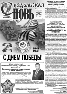 С ДНЕМ ВЕЛИКОЙ ПОБЕДЫ! общественно политическая газета УЗДАЛЬСКАЯ № 35 (12506) среда, 8 мая 2024 г. 3 УВАЖАЕМЫЕ ВЕТЕРАНЫ, ТРУЖЕНИКИ ТЫЛА, ЖИТЕЛИ СУЗДАЛЬСКОЙ ЗЕМЛИ! СЕРДЕЧНО ПОЗДРАВЛЯЕМ ВАС С 79-Й ГОДОВЩИНОЙ ПОБЕДЫ В ВЕЛИКОЙ ОТЕЧЕСТВЕННОЙ ВОЙНЕ! Сотрудники силового ведомства, охраняющие ежедневный труд и быт россиян, прекрасно понимают, сколько героизма и мужества, стойкости и преданности Родине пришлось проявить советским людям, чтобы войти в историю цивилизации победителями фашистской чумы. Мы безмерно гордимся защитниками Отечества и благодарны им за Победу. Желаем вам здоровья, бодрости духа и хорошего настроения. Мы будем достойными продолжателями ваших боевых и трудовых традиций. С великим праздником вас! С Днем Победы! МАКСИМ ЧУБУКОВ, начальник ОМВД России по Суздальскому району подполковник полиции. АЛЕКСЕЙ КУЗИН, председатель Совета ветеранов органов МВД России по Суздальскому району. ВЛАДИМИР СУХОВ, председатель Общественного совета при ОМВД России по Суздальскому району. ДОРОГИЕ ВЕТЕРАНЫ ВЕЛИКОЙ ОТЕЧЕСТВЕННОЙ ВОЙНЫ, ТРУЖЕНИКИ ТЫЛА, ДЕТИ ВОЙНЫ! УВАЖАЕМЫЕ ЖИТЕЛИ И ГОСТИ СУЗДАЛЬСКОЙ ЗЕМЛИ! Руководство и коллектив ООО «Промрукав» сердечно поздравляют вас со знаменательной датой - ДНЁМ ВЕЛИКОЙ ПОБЕДЫ! 9 Мая занимает особое место в истории нашей страны, в судьбе народа, когда восторжествовал мир и справедливость. Мы гордимся священным подвигом отцов, дедов и прадедов, равняемся на их мужество и силу духа. Ведь долгожданная Победа завоевана очень высокой ценой, которая унесла и искалечила жизни миллионов советских людей, посеяла ужас и разруху. Но наш народ сумел выстоять и сокрушить врага. Мужественно и самоотверженно, не жалея себя, с искренней любовью к Родине Победу ковали все: фронтовики и труженики тыла, взрослые и дети. Мы преклоняемся перед победителями, благодаря подвигу которых мы сейчас живем, работаем и растим детей. ООО «Промрукав». Сегодня как никогда важно не только сохранить, но и отстаивать правду о Великой Отечественной войне, беречь память о героях тех времен и помнить какую цену заплатил советский народ. Ведь связь времен и преемственность поколений сегодня особенно важна. Дорогие друзья! От души желаем вам здоровья, удачи, радости, весеннего расцвета творческих, сил, энергии, оптимизма. Пусть в вашем доме царят солнечный свет, весеннее тепло, добрые улыбки, радость любви и взаимопонимания! ДОРОГИЕ ВЕТЕРАНЫ ВЕЛИКОЙ ОТЕЧЕСТВЕННОЙ ВОЙНЫ, ТРУЖЕНИКИ ТЫЛА, ДЕТИ ВОЙНЫ! УВАЖАЕМЫЕ ЖИТЕЛИ ГОРОДА СУЗДАЛЯ! Примите самые сердечные поздравления с 79-й годовщиной Победы в Великой Отечественной войне! Целая человеческая жизнь отделяет нас от мая 1945 года, но время лишь усиливает величие совершенного советским народом подвига, который в наших сердцах будет жить вечно. 9 Мая – День Победы – был и остается всенародным, дорогим для каждого русского человека праздником, объединяющим все поколения. Нет подвига выше, чем подвиг героев, в смертельной схватке защитивших Отечество и спасших мир от фашизма. Чем дальше от нас те суровые и священные дни, тем ярче в памяти людей понимание глобальной значимости Победы. На примере героев Великой Отечественной войны воспитано не одно поколение молодых граждан России. И сегодня мы по-прежнему черпаем силы в этом бесценном источнике, укрепляем связь времен и поколений. В этот празднич