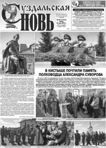 Газета основана 21 марта 1918 г. № 39 (12510) среда, 22 мая 2024 г. Общественно политическая газета 12+ В службе и церемонии возложения цветов участвовали генерал-майор Александр Черкасов, руководитель инициативной группы по возрождению Суворовского храма в селе Кистыш, председатель попечительского совета РОО ветеранов и инвалидов «ОмофорСуворовский призыв», Василий Верещак, председатель правления ВРОО «Архитектурно–исторический комплекс Генералиссимуса А.В. Суворова», более ста человек из Москвы, Владимира, Коврова, Суздаля, Переславля-Залесского, жители сел Кистыш, Весь, Вишенки, Романово. Литургию служил протоиерей Игорь Любченко, духовный наставник инициативной группы по возрождению Суворовского храма в 2011 - 2014 гг., участник боевых действий в Сирии. Ему сослужили иереи Иоанн Власов и Александр Гордымов. После службы участники торжественного мероприятия слушали песни в исполнении известного суздальского поэта и исполнителя, члена Союза писателей России Анатолия Евсеенко. В Литургии принимали участие кадеты Суздальской Православной гимназии, военнослужащие и музыканты оркестра 467 гвардейского окружного учебного центра. После завершения службы ее участники прошли по селу к памятнику Суворову под музыку военного оркестра. У памятника стоял почетный воинский караул. После возложения гирлянды Славы и цветов прозвучали Гимн Российской Федерации и оружейный салют в честь великого русского полководца Александра Суворова. Фото http://www.omofor.ru В КИСТЫШЕ ПОЧТИЛИ ПАМЯТЬ ПОЛКОВОДЦА АЛЕКСАНДРА СУВОРОВА В честь 224-й годовщины со дня кончины Александра Васильевича Суворова 18 мая в возрождаемом Суворовском храме села Кистыш состоялись Литургия, Панихида памяти великого полководца, возложение гирлянды Славы и цветов к его памятнику у здания музея. Организаторами праздника Памяти Суворова были - Региональная общественная организация ветеранов и инвалидов силовых структур «Омофор - Суворовский Призыв» и Владимирская региональная общественная организация (ВРОО) «Архитектурно– исторический комплекс Генералиссимуса А.В. Суворова» в селе Кистыш. Справки по телефону 8 (49231) 2-08-95. ПОДПИСКА НА ГАЗЕТУ «СУЗДАЛЬСКАЯ НОВЬ» НА 2-е ПОЛУГОДИЕ 2024 ГОДА Реклама ОФОРМИТЬ ПОДПИСКУ МОЖНО В РЕДАКЦИИ по адресу: г. Суздаль, Красная пл., д.1, каб.12,18. Стоимость подписки: с доставкой на дом - 460 руб. (г. Суздаль, не менее 5 экземпляров); по району - 490 руб., с получением в редакции - 400 руб. на 6 месяцев. УВАЖАЕМЫЕ ЖИТЕЛИ ПОСЕЛКА КРАСНОГВАРДЕЙСКИЙ, СЕЛ ПАВЛОВСКОЕ, ПОРЕЦКОЕ, ОМУТСКОЕ! Сообщаем вам, что у редакции есть возможность доставлять вам газету «Суздальская новь». Подписаться на газету можно в Красногвардейской сельской библиотеке у библиотекаря Сараевой Елены Викторовны, в Павловской библиотеке у библиотекаря Татьяны Геннадьевны Васильевой, в с. Порецкое у Галины Александровны Молчановой в магазине, в с.Омутское у библиотекаря Веры Владимировны Савельевой. Кадеты Суздальской Православной гимназии. Иерей Иоанн Власов, протоиерей Игорь Любченко (справа). Цветы к памятнику А. Суворову возлагает Александр Черкасов. Под звуки военного оркестра. На службе в Суворовском храме. В центре Василий Верещак. Гирлянда Славы в честь великого полководца Александра Суворова. Памятник Александру Суворову в Кистыше.