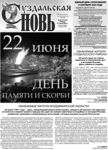 Газета основана 21 марта 1918 г. № 48 (12519) пятница, 21 июня 2024 г. Общественно политическая газета 12+ Никогда не забудем мужество и самоотверженность наших предков, которые все как один встали на защиту Родины. Они бились с абсолютным злом, угрозой для всего человечества – немецким фашизмом и теми, кто примкнул к гитлеровской Германии. Война принесла горе и страдание в каждую семью, но врагу так и не удалось сломить наш дух. Миллионы людей, не щадя своих жизней, сражались на фронте и в партизанских отрядах, трудились в тылу, всеми силами приближая долгожданную Победу. Свой вклад в разгром коричневой чумы внесла и Владимирская область. На пятый день войны вся страна узнала о подвиге муромлянина Николая Гастелло, который направил свой горящий бомбардировщик на скопление вражеской военной техники. 19 марта 1942 года житель Владимира Евгений Пичугин в воздушном бою протаранил немецкий самолет. Всего около 300 тысяч наших земляков ушли на фронты Великой Отечественной. Почти половина из них не вернулась домой. Практически все крупные заводы региона перешли на военные рельсы, наладив выпуск вооружения и боеприпасов. Каждый третий пулемёт и каждый второй автомат был выпущен в Коврове. Всего за годы войны только завод имени Дегтярёва произвёл 1,2 млн единиц различного вооружения – автоматы ППШ, противотанковые ружья, пулемёты. Сегодня мы склоняем головы перед светлой памятью тех, кто отстоял свободу и независимость страны. Всё, что у нас есть – мирное небо, большая и сильная держава – это живое свидетельство великого подвига поколения победителей. Но за это заплачена дорогая цена – 27 миллионов жизней. Поэтому наш священный долг – сохранить историческую память, передать всю правду о тех событиях нашим детям и внукам. К сожалению, с каждым годом всё меньше ветеранов в наших рядах, но на их место приходят новые герои. С первых дней специальной военной операции тысячи добровольцев встали плечом к плечу вместе с защитниками Донецка и Луганска. Как и нашим прадедам им предстоит разбить возродившийся нацизм и обезопасить рубежи России. Успех на поле боя – это во многом надёжный и крепкий тыл. Страна, как и 83 года назад, продемонстрировала единство и сплочённость. Жители собирают дополнительную помощь нашим бойцам, отправляют на передовую беспилотники, экипировку, приборы ночного видения. Огромное спасибо всем за неравнодушие и поддержку военнослужащих. Уверен, вместе мы обязательно выстоим, справимся со всеми вызовами. Правда на нашей стороне, а значит победа обязательно будет за нами! А.А.АВДЕЕВ, Губернатор области. УВАЖАЕМЫЕ ЖИТЕЛИ СУЗДАЛЬСКОГО РАЙОНА! 22 июня одна из самых памятных и трагических дат в истории России - День памяти и скорби. В этот день в 1941 году началась Великая Отечественная война, самая страшная и кровопролитная в мировой истории, которая унесла миллионы жизней, горем и страданиями ворвалась в каждый дом. С тех пор прошло немало лет, но время не в силах исцелить душевные раны и заставить нас забыть о том, сколько боли и испытаний выпало на долю нашей Родины. В День памяти и скорби мы отдаем дань глубокой признательности и уважения фронтовикам, труженикам тыла, вдовам и детям войны, всем тем, кто день и ночь приближал Победу. Мы скорбим о тех, кто не вернулся домой, кто не дожил до сегодняшних дней. Мы никогда не забудем об их великом п