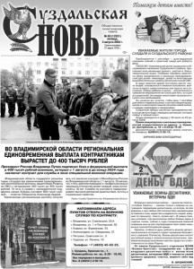 Газета основана 21 марта 1918 г. № 60 (12531) пятница, 2 августа 2024 г. Общественно политическая газета 12+ ВО ВЛАДИМИРСКОЙ ОБЛАСТИ РЕГИОНАЛЬНАЯ ЕДИНОВРЕМЕННАЯ ВЫПЛАТА КОНТРАКТНИКАМ ВЫРАСТЕТ ДО 400 ТЫСЯЧ РУБЛЕЙ «Владимирская область поддержит решение главы государства увеличением единовременной региональной выплаты защитникам Родины на СВО с сегодняшних 250 тысяч до 400 тысяч рублей. То есть в сумме с президентской поддержка наших бойцов составит 800 тысяч рублей», – отметил Губернатор Александр Авдеев. Увеличенную региональную выплату получат все, кто заключит контракт с Минобороны России во Владимирской области с 1 августа. Отметим, что стать военнослужащим и профессионально защищать Отечество может каждый, кому исполнилось 18 лет. Служба по контракту предусматривает высокое денежное довольствие, льготы и социальные гарантии. Пресс-служба Правительства Владимирской области. Президент России Владимир Путин подписал Указ о федеральной выплате в 400 тысяч рублей военным, которые с 1 августа и до конца 2024 года заключат контракт для службы в зоне специальной военной операции. НАПОМИНАЕМ АДРЕСА ПУНКТОВ ОТБОРА НА ВОЕННУЮ СЛУЖБУ ПО КОНТРАКТУ: г. Владимир, ул. Стрелецкая, 55 А. г. Владимир, ул. 1-я Пионерская, 92. г. Ковров, ул. Фурманова, 33. г. Александров, ул. Свердлова, 37. г. Петушки, Советская пл., 5. г. Судогда, ул. Ленина, 19. Телефон: +7 (4922) 45-02-25. г. Суздаль, Красная пл., 1. Режим работы: пн.-вс. 8.00 - 18.00, без перерыва и выходных. Тел. 8 (49231) 2 00 16. Губернатор Владимирской области Александр Авдеев с участниками СВО. УВАЖАЕМЫЕ ЖИТЕЛИ ГОРОДА СУЗДАЛЯ И СУЗДАЛЬСКОГО РАЙОНА! Приближается 1 сентября — долгожданный праздник знаний и приятный повод для доброго дела. ГБУСО ВО «Комплексный центр социального обслуживания населения Суздальского района» приглашает всех желающих принять участие в благотворительной акции «Соберем портфель вместе!» по сбору канцелярских и школьных принадлежностей для детей- инвалидов, детей из многодетных малообеспеченных семей и детей участников СВО . В наше нелегкое время постоянно растет число людей, оказавшихся в тяжелом положении, выйти из которого самостоятельно они просто не в состоянии. Сборы ребенка в школу – волнительное и тревожное мероприятие не только для него, но и для его родителей. Не каждая семья имеет возможность купить все необходимое. Но, конечно же, хочется, чтобы день 1 сентября для любого первоклассника стал настоящим праздником и в некотором смысле началом новой жизни, с новыми надеждами и ожиданиями. Собранные наборы школьных принадлежностей в конце августа будут переданы детишкам, которые пойдут в первый класс. Акция проводится в период с 22 июля по 23 августа 2024г. Прием канцелярских и школьных принадлежностей осуществляется по адресу: п. Новый, ул. Центральная, д. 18 с 8.00 до 16.00 . Дополнительную информацию можно получить по телефону 8(49231) 2-52-12. ЗАРАНЕЕ ВАМ БЛАГОДАРНЫ! Воздушно-десантные войска – «крылатая пехота», «голубые береты» – какими только словами не награждали гвардейцев-десантников, но всегда, во все времена и при любых обстоятельствах неизменными оставались сила, мужество и надежность людей, живущих по принципу: «Никто, кроме нас!». В самых сложных условиях, при выполнении любых боевых задач в горячих точках, сейчас в ходе специальной военной операции они не раз подтверждали свое право называться элитой Ро