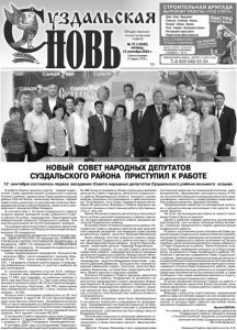 Официальный вестник 2 № 72 (12543) пятница, 13 сентября 2024 г. общественно политическая газета УЗДАЛЬСКАЯ СОВЕТ НАРОДНЫХ ДЕПУТАТОВ СУЗДАЛЬСКОГО РАЙОНА РЕШЕНИЕ от 12.09.2024 № 2 Об избрании председателя Совета народных депутатов Суздальского района В соответствии с Федеральным законом от 06.10.2003 № 131-ФЗ «Об общих принципах организации местного самоуправления в Российской Федерации», Уставом Суздальского района, статьями 13 и 14 Регламента Совета народных депутатов Суздальского района, утверждённого решением Совета народных депутатов Суздальского района от 19.06.2019 № 58, на основании протокола заседания счётной комиссии № 2 от 12.09.2024 по избранию председателя Совета народных депутатов Суздальского района Совет народных депутатов Суздальского района решил: 1. Избрать председателем Совета народных депутатов Суздальского района Кириллова Владимира Вячеславовича, депутата по избирательному округу № 18. 2. Настоящее решение вступает в силу со дня его принятия и подлежит официальному обнародованию в газете «Суздальская новь». В.В.КИРИЛЛОВ, председатель Совета народных депутатов района. СОВЕТ НАРОДНЫХ ДЕПУТАТОВ СУЗДАЛЬСКОГО РАЙОНА РЕШЕНИЕ от 12.09.2024 № 3 Об избрании заместителя председателя Совета народных депутатов Суздальского района В соответствии с Уставом Суздальского района Владимирской области, статьей 15 Регламента Совета народных депутатов Суздальского района, утверждённого решением Совета народных депутатов Суздальского района от 19.06.2019 № 58, на основании протокола заседания счётной комиссии № 3 от 12.09.2024 по избранию заместителя председателя Совета народных депутатов Суздальского района Совет народных депутатов Суздальского района решил: 1. Избрать заместителем председателя Совета народных депутатов Суздальского района Петрикова Алексея Петровича, депутата по избирательному округу № 3. 2. Настоящее решение вступает в силу со дня его принятия и подлежит официальному обнародованию в газете «Суздальская новь». В.В.КИРИЛЛОВ, председатель Совета народных депутатов района. СОВЕТ НАРОДНЫХ ДЕПУТАТОВ СУЗДАЛЬСКОГО РАЙОНА РЕШЕНИЕ от 12.09.2024 № 11 О временном исполнении полномочий главы Суздальского района В соответствии с Законом Владимирской области от 14.11.2014 № 120-ОЗ «О порядке формирования представительных органов муниципальных районов Владимирской области и порядке избрания глав муниципальных образований Владимирской области», Уставом Суздальского района Владимирской области Совет народных депутатов Суздальского района решил: 1. В связи с истечением срока полномочий главы администрации Суздальского района Сараева Алексея Петровича возложить временное исполнение полномочий главы Суздальского района на первого заместителя главы администрации района по внутренней и социальной политике Срибную Татьяну Александровну с 12.09.2024 до вступления в должность вновь избранного главы Суздальского района. 2. Настоящее решение вступает в силу со дня принятия и подлежит официальному обнародованию в газете «Суздальская новь». В.В.КИРИЛЛОВ, председатель Совета народных депутатов района. СОВЕТ НАРОДНЫХ ДЕПУТАТОВ СУЗДАЛЬСКОГО РАЙОНА РЕШЕНИЕ от 12.09.2024 № 12 Об утверждении Порядка проведения конкурса по отбору кандидатур на должность главы Суздальского района В соответствии с Федеральными законами от 12.06.2002 № 67-ФЗ «Об основных гарантиях и
