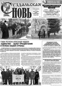 Газета основана 21 марта 1918 г. № 87 (12558) среда, 6 ноября 2024 г. Общественно политическая газета 12+ Справки по телефону 8 (49231) 2-08-95. ПОДПИСКА НА ГАЗЕТУ «СУЗДАЛЬСКАЯ НОВЬ» Реклама С ЛЮБОГО ЧИСЛА, ЛЮБОГО МЕСЯЦА ОФОРМИТЬ ПОДПИСКУ МОЖНО В РЕДАКЦИИ по адресу: г. Суздаль, Красная пл., д.1, каб.12,18. СТОИМОСТЬ ПОДПИСКИ НА 1 МЕСЯЦ: с доставкой на дом - 72 рубля (г. Суздаль, не менее 5 экземпляров); по району - 77 рублей; с получением в редакции - 67 рублей. Подвиг Пожарского и Минина золотыми буквами вписан в историю России. Их имена всегда ассоциировались с истинным патриотизмом и самоотверженностью. Более 400 лет назад жители России сплотились перед лицом общей угрозы и отстояли независимость своего Отечества. С этой победы началось окончание сложного периода нашей истории – Смутного времени. «День народного единства - праздник, который плотно вошёл в сознание наших людей. Особенно это ценно в настоящее время, когда мы видим, что не отступают враги от нашей страны. Мы видим, как история повторяется, и именно сейчас перед нами стоит такая же задача - быть едиными на фронте, в тылу, в обществе. В этом единстве как раз залог процветания, успеха России и победы», - отметил Александр Авдеев. «Духовного единства не может быть без духовно-нравственного начала. Сегодня мы переживаем это духовно-нравственное возрождение, которое и крепит наш народ вместе. И это делает его непобедимым», - добавил митрополит Владимирский и Суздальский Тихон. В завершение митинга в Спасо-Евфимиевом монастыре его участники возложили цветы к могиле Дмитрия Михайловича Пожарского в знак уважения к национальному герою России и всем соотечественникам, храбро защищавшим Отечество. «Это совершенно правильно, что у нас сложилась такая традиция - 4 ноября собираться у усыпальницы князей Пожарских. Важно и то, что две ветви власти в нашем регионе - исполнительная и законодательная - работают в единой команде. Это прежде всего в интересах жителей нашего региона», - считает председатель Законодательного Собрания Ольга Хохлова. Также глава региона встретился с участниками ГЛАВА РЕГИОНА АЛЕКСАНДР АВДЕЕВ: «ЕДИНСТВО – ЗАЛОГ ПРОЦВЕТАНИЯ И УСПЕХА НАШЕЙ СТРАНЫ» 4 ноября в Суздале состоялось торжественное мероприятие, посвящённое Дню народного единства. Ежегодно в этот праздник у фамильной усыпальницы князей Пожарских проходит митинг, чтобы отдать дань уважения национальному герою России – Дмитрию Пожарскому, который возглавил народное ополчение, освободившее Москву от польско-литовских интервентов. ВЛАДИМИР ПУТИН ПОЗДРАВИЛ ЖИТЕЛЕЙ ВЛАДИМИРСКОЙ ОБЛАСТИ С ДНЁМ НАРОДНОГО ЕДИНСТВА Президент России Владимир Путин поздравил Губернатора Александра Авдеева и в его лице всех жителей Владимирской области с Днём народного единства. «Незыблемые традиции патриотизма и сплочённости, прочная нравственная, духовная опора помогали нашим предкам преодолевать суровые испытания, созидать великую державу. Их ратные подвиги и трудовые свершения, искреннее стремление служить Отечеству всегда будут для нас вдохновляющим примером беззаветной любви к Родине, ответственности за её судьбу. Желаю Вам успехов и всего самого доброго», – говорится в поздравлении главы государства. ПОЗДРАВЛЕНИЕ ПРЕДСЕДАТЕЛЯ ГОСУДАРСТВЕННОЙ ДУМЫ Председатель Государственной Думы Вячеслав Володин поздравил с Днём народного единс