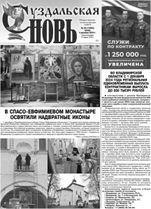 Газета основана 21 марта 1918 г. № 95 (12566) среда, 4 декабря 2024 г. Общественно политическая газета 12+ В соответствии с указом Президента Владимира Путина федеральная выплата в 400 тысяч рублей установлена военным, которые с 1 августа и до конца 2024 года заключат контракт для службы в зоне специальной военной операции. «Владимирская область поддержала решение главы государства увеличением единовременной региональной выплаты защитникам Родины на СВО с 1 декабря 2024 года до 800 тысяч рублей. В таком размере заключившие контракт с Минобороны России будут получать её до конца следующего года. То есть в сумме с президентской поддержка наших бойцов составит 1 миллион 200 тысяч рублей», – отметил губернатор Александр Авдеев. Кроме того, по решению Президента России некоторым участникам специальной военной операции и их жёнам могут быть списаны просроченные кредиты до 10 млн рублей. Документ опубликован на официальном портале правовой информации и вступил в силу с 1 декабря 2024 года. Так, новый федеральный закон прекращает обязательства по кредитным договорам мобилизованных бойцов, призывников (кроме курсантов военных училищ и вузов) и других граждан, заключивших контракт о службе в Вооружённых Силах РФ с 1 декабря 2024 года минимум на год, а также их жёнам. Списаны могут быть кредиты, по которым до 1 декабря 2024 года вступил в силу судебный акт о взыскании задолженности и было возбуждено исполнительное производство. При этом сумма кредитных обязательств не должна превышать 10 млн рублей. Закон также продлевает кредитные каникулы для участников СВО. Обратиться к кредитору с требованием об их предоставлении бойцы могут до 31 декабря 2024 года. Раньше отсрочку давали на срок мобилизации или срок контракта, увеличенные на 30 дней. Теперь льготный период расширен с 30 до 180 дней. Отметим, что стать военнослужащим и профессионально защищать Отечество может каждый, кому исполнилось 18 лет. Служба по контракту предусматривает высокое денежное довольствие, льготы и социальные гарантии. Напоминаем адреса пунктов отбора на военную службу по контракту: г.Владимир, ул. Стрелецкая, 55 А; г.Владимир, ул. 1-я Пионерская, 92; г.Ковров, ул. Фурманова, 33; г.Александров, ул. Свердлова, 37; г.Петушки, Советская пл., 5; г.Судогда, ул. Ленина, 19; г.Суздаль, Красная пл., 1. Телефон: +7 (4922) 45-02-25. ВО ВЛАДИМИРСКОЙ ОБЛАСТИ С 1 ДЕКАБРЯ 2024 ГОДА РЕГИОНАЛЬНАЯ ЕДИНОВРЕМЕННАЯ ВЫПЛАТА КОНТРАКТНИКАМ ВЫРОСЛА ДО 800 ТЫСЯЧ РУБЛЕЙ 1 декабря в Преображенском соборе Спасо-Евфимиева монастыря г. Суздаля настоятель иеромонах Арсений (Смирнов) совершил чин освящения надвратных икон. 4 иконы для проездной башни и 2 для Благовещенского храма обители были изготовлены в технике силикатной живописи преподавателями и студентами Российской академии живописи, ваяния и зодчества Ильи Глазунова, которые трудились почти год. На следующий день сотрудники академии и Владимиро-Суздальского государственного музея-заповедника развесили новые иконы по местам. Это еще один подарок к 1000-летию г. Суздаля от Владимиро-Суздальского музея-заповедника и ведущего художественного вуза страны. https://spaso-evfimiev.ru/ В СПАСО-ЕВФИМИЕВОМ МОНАСТЫРЕ ОСВЯТИЛИ НАДВРАТНЫЕ ИКОНЫ