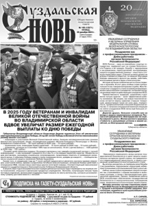 Газета основана 21 марта 1918 г. № 100 (12571) пятница, 20 декабря 2024 г. Общественно политическая газета 12+ Справки по телефону 8 (49231) 2-08-95. ПОДПИСКА НА ГАЗЕТУ«СУЗДАЛЬСКАЯ НОВЬ» Реклама С ЛЮБОГО ЧИСЛА, ЛЮБОГО МЕСЯЦА ОФОРМИТЬ ПОДПИСКУ МОЖНО В РЕДАКЦИИ по адресу: г. Суздаль, Красная пл., д.1, каб.12,18. СТОИМОСТЬ ПОДПИСКИ НА 1 МЕСЯЦ: с доставкой на дом по Суздалю - 77 рублей (г. Суздаль, не менее 5 экземпляров); по району - 82 рубля; с получением в редакции - 67 рублей. УВАЖАЕМЫЕ СОТРУДНИКИ И ВЕТЕРАНЫ УПРАВЛЕНИЯ ФЕДЕРАЛЬНОЙ СЛУЖБЫ БЕЗОПАСНОСТИ РОССИИ ПО ВЛАДИМИРСКОЙ ОБЛАСТИ! Поздравляю вас с профессиональным праздником – Днём работника органов безопасности Российской Федерации! ФСБ России – одна из важнейших структур государства, надёжный щит на страже безопасности Родины и её граждан. Борьба с терроризмом и экстремизмом, наркоторговлей, контрразведка, защита государственной границы – лишь часть стоящих перед вами задач. О ваших успехах далеко не всегда становится известно, но именно благодаря бойцам невидимого фронта мы живём, работаем, воспитываем детей в мире и благополучии. История органов госбезопасности полна подвигов и героизма. В этот день особые слова признательности мы говорим ветеранам службы. Ваш богатый опыт и мудрость стали основой для формирования самых высоких стандартов, которыми сегодня руководствуются действующие сотрудники ФСБ. Преемственность традиций, сохранение и развитие лучших практик – залог эффективной работы силовиков. Мы видим, как новые поколения воинов остаются верны идеалам старших товарищей, демонстрируя такую же силу духа, порядочность, профессионализм и высокие моральные качества. С началом специальной военной операции на плечи сотрудников ФСБ легла ещё большая ответственность. Дорогие друзья, большое спасибо вам за вклад в защиту национальных интересов России и её суверенитета. Благодарю вас за службу и верность долгу. Желаю крепкого здоровья, стойкости и дальнейших успехов в вашей нелёгкой, но благородной миссии. А.А.АВДЕЕВ, Губернатор области. УВАЖАЕМЫЕ СОТРУДНИКИ И ВЕТЕРАНЫ ОРГАНОВ БЕЗОПАСНОСТИ СУЗДАЛЬСКОГО РАЙОНА! Поздравляем вас с профессиональным праздником – Днем работника органов безопасности Российской Федерации! Невозможно переоценить вклад органов государственной безопасности в дело защиты национальных интересов нашей страны, ее суверенитета и территориальной целостности, а также в сох– ранение незыблемости конституционного строя. Вы всегда находитесь на переднем крае борьбы с экстремизмом, терроризмом, коррупцией, киберпреступлениями и организованной преступностью. Сейчас наша страна переживает непростое время: мы сталкиваемся с новыми вызовами и внешними угрозами, а также с беспрецедентным санкционным давлением. Однако, ежедневная работа ФСБ способствует обеспечению государственной безопасности и неукоснительному соблюдению норм, закрепленных в Конституции нашей страны. Желаем личному составу отделения управления ФСБ России по Владимирской области в г. Суздале и ветеранам службы здоровья, благополучия, надежного тыла и дальнейших успехов на благо Отечества! А.П. САРАЕВ, глава Суздальского района. В.В. КИРИЛЛОВ, председатель Совета народных депутатов Суздальского района. В 2025 ГОДУ ВЕТЕРАНАМ И ИНВАЛИДАМ ВЕЛИКОЙ ОТЕЧЕСТВЕННОЙ ВОЙНЫ ВО ВЛАДИМИРСКОЙ ОБЛАСТИ ВДВОЕ УВЕЛИЧАТ 