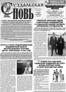 общественно политическая газета УЗДАЛЬСКАЯ 2 № 2 (12575) среда, 15 января 2025 г. ДЕНЬ РОССИЙСКОЙ ПЕЧАТИ Уважаемые читатели, сегодня мы вместе с вами хотим вспомнить о знаменательных событиях последних лет, о которых мы писали на страницах «Суздальской нови». В 2023 году наша районная газета отметила 105-летний юбилей. Она продолжает оставаться главным летописцем Суздальского района. О многих важных событиях, которые происходят в районе, области, нашей стране читатели узнают именно из нее. Какая сейчас газета, нам , ее работникам, судить сложно. Оценку пусть дают читатели - но ни один номер газеты не похож на предыдущий. Мы стараемся, чтобы в каждом номере было, что почитать, несмотря иногда на обилие официальной информации, материалов разных пресс-служб, ведомств, служб, которые обязаны информировать население о своей деятельности - прокуратуры, налоговой инспекции, суда, полиции, ГО и ЧС. Кроме того, газета связана определенными обязательствами с администрациями города Суздаля, Суздальского района и сельских поселений, Правительством Владимирской области и Законодательным Собранием, с которыми работает в рамках заключенных договоров и государственных контрактов. Мы стараемся, чтобы информация в газете была разнообразной. Именно поэтому на страницах «Суздальской нови» выходят разные тематические странички - Суздальского индустриально-гуманитарного колледжа, Комплексного центра социального обслуживания населения Суздальского района, Межпоселенческого культурно-досугового центра Суздальского района, тематические приложения- «Музейный ГРАД», «Свеча души», «Наше наследие», «Молодежный АКЦЕНТ», «Забота. Защита. Помощь», «Закон и порядок», «Милосердие», «Вестник депутата», «СПОРТобозрение», «Ваше право», «Официальный вестник», «Читатель-Газета-Читатель», «Дело Суворова живет и побеждает» и др. И список их пополняется. Так в прошлом году вышло приложение «Защитники Отечества. СВОих не бросаем!». У работников газеты есть новые творческие планы, интересные проекты, которые мы планируем претворить в жизнь в 2025 году, в год 80-летия Победы в Великой Отечественной войне, Год защитника Отечества. Вот уже не первый год мы проводим подписку газеты в редакции, где ее читатели и получают, и доставляем ее читателям г. Суздаля и отдельных территорий Суздальского района - сел Павловское, Омутское, Порецкое, Туртино, Крапивье, пос. Красногвардейский. Очень благодарны людям, которые помогают нам это делать: библиотекарям - Елене Викторовне Сараевой, Вере Владимировне Савельевой, Татьяне Геннадьевне Васильевой, Светлане Степановне Крючковой, а также Галине Александровне Молчановой из с. Порецкое, Марине Клигер из с. Павловское, Галине Николаевне Спепковой из Суздаля, Елене Чапиной из Крапивья, Владимиру Сухову, Ольге Батяевой - из Суздаля, Полине Панфиловой из с. Омутское. Существенный фактор, который мы хотим отметить, стоимость в редакции подписки гораздо дешевле, чем на почте. Почти в каждом номере газеты мы даем объявления об условиях подписки и в редакции, и на почте. Пожалуйста, уважаемые читатели, читайте их внимательно. Там все подробно сказано. Особо хотим подчеркнуть, что в редакции можно подписаться с любого числа месяца, не бояться, что опоздали. Но и не откладывайте это в долгий ящик, чтобы не лишать себя местных новостей. 2024 год остался в