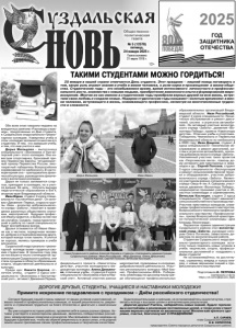 Газета основана 21 марта 1918 г. № 5 (12578) пятница, 24 января 2025 г. Общественно политическая газета 12+ Обо всем этом говорили недавно на внеурочных занятиях «Разговоры о важном», приуроченных ко Дню студента, в Суздальском индустриально-гуманитарном колледже. Наверняка учеба в этом колледже запомнится многим его студентам. И тем, кто завершил учебу, и тем, кто еще учится в нем. Дарья Жильцова – выпускница специальности «Экономика и бухгалтерский учет» этого колледжа. Она известная спортсменка, бронзовый призер Первенства Европы, четырехкратный призер Первенства России, многократный победитель Всероссийских соревнований по кикбоксингу. В настоящее время она – преподаватель физической культуры, руководитель физического воспитания колледжа. Дарья не только занимается спортом, преподает в колледже, но и учится дальше. Ее цель – получить высшее педагогическое образование в ВлГУ, опорном вузе Владимирской области. Иван Ивкин, студент 4 курса специальности «Гостиничное дело». Он активист Движения Первых, староста группы. Иван - волонтер добровольческого отряда «Забота», помогает в проведении различных общественно значимых мероприятий. Будущая профессия Ивану нравится, и выбор на нее пал не случайно. Суздаль- город туристический и работа по такой специальности будет востребована всегда. Друзья отзываются об Иване Ивкине как о честном, порядочном человеке, добром и отзывчивом верном друге, который всегда готов помочь. И учится он хорошо, являясь примером в учебе для многих. Суздальский индустриально-гуманитарный колледж может гордиться своими студентами. В прошлом году ряд из них вошел в число стипендиатов администрации Суздальского района, они стали лучшими в области образования, спорта, общественной деятельности и культуры. Среди них: Никита Карпов, отличник учебы, студент 2 курса специальности «Экономика и бухгалтерский учет», активист Движения Первых, ТАКИМИ СТУДЕНТАМИ МОЖНО ГОРДИТЬСЯ! 25 января в нашей стране отмечается День студента. Этот праздник – лишний повод поговорить о том, какую роль играют знания и учеба в жизни человека, о роли науки и просвещения в жизни общества. Студенческие годы – это незабываемое время, время интенсивного личностного и профессионального роста, знакомства с новыми людьми, приобретение жизненного опыта и формирования мировоззрения. Многие из нас именно в студенческие годы приобрели верных друзей на всю жизнь, встретили свою любовь и создали семью. Недаром студенческие годы называют «золотым временем» в жизни человека, вступающего в жизнь, осваивающего профессию, несмотря на многочисленные трудности и сложности. федерального проекта «Навигаторы детства», участник молодежного медиацентра колледжа; Алена Демьянова, отличница учебы, студентка 2 курса специальности «Экономика и бухгалтерский учет». Активный участник разных мероприятий, проводимых в колледже, добровольческой деятельности. Участник регионального конкурса «Мой бизнес. Профессионалы-2024». Победитель олимпиады по русскому языку среди обучающихся профессиональных образовательных организаций Владимирской области; Иван Российский, студент 2 курса специальности «Техническое обслуживание и ремонт двигателей, систем и агрегатов автомобилей». Он активный участник волонтерского отряда «Забота», движения «Волонтеры Победы», п