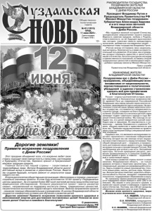 ПОЗДРАВЛЯЕМ С ПРАЗДНИКОМ! общественно политическая газета УЗДАЛЬСКАЯ № 42 (12615) среда, 11 июня 2025 г. 3 ДОРОГИЕ ЗЕМЛЯКИ! РАБОТНИКИ ПРЕДПРИЯТИЙ АО «СУВОРОВСКОЕ», ООО «СТАРОДВОРСКИЙ»! 12 июня мы будем отмечать большой государственный праздник — День России. Это праздник страны с многовековой историей, богатым историческим, культурным наследием. Это праздник тех, кто любит свою Родину и гордится ей. Для многих она начинается с малой родины, места, где мы родились, где ходили в школу, работаем, растим детей и внуков. Мы должны хорошо понимать и осознавать то, что величие России, ее процветание зависят только от нас с вами, ее граждан, от того, как мы будем воспитывать своих детей, как будем учить их быть патриотами. Сейчас, в непростое для России время, время проведения специальной военной операции, мы еще больше, каждый на своем месте, должны работать, ответственно подходить к учебе, к патриотическому воспитанию молодежи, помощи нашим бойцам на передовой. Поздравляю всех с праздником и хочу пожелать всем нам, жителям России, здоровья, процветания, успехов в работе и скорейшей Победы! Сергей ТРУТНЕВ, генеральный директор АО «Суворовское», ООО «Стародворский», член Общественной палаты Суздальского района. УВАЖАЕМЫЕ ЖИТЕЛИ СУЗДАЛЬСКОГО РАЙОНА! От имени работников СПК «Гавриловское» поздравляю вас с Днем России! На протяжении столетий наши предки создавали великое государство, которым мы сейчас гордимся. Вместе решаем важные задачи, вносим вклад в улучшение жизни наших граждан, в развитие и процветание нашего родного края, Владимирской области, Суздальского района. Наша страна видела многое. В этом году мы отмечаем 80-летие Победы в Великой Отечественной войне. В той войне наши отцы и деды с оружием в руках завоевали нам право жить на свободной земле, под чистым небом. К сожалению, сейчас снова приходится доказывать свою любовь к Родине с оружием в руках. Но мы все преодолеем, потому что за нами - Россия. Желаю всем в этот государственный праздник здоровья, веры в лучшее, стабильности в жизни и успехов в работе во имя нашей любимой Родины! Сергей ПАНКРАТОВ, председатель СПК «Гавриловское», Почетный гражданин Суздальского района. УВАЖАЕМЫЕ ЖИТЕЛИ СУЗДАЛЬСКОГО РАЙОНА, РАБОТНИКИ ООО «ПЛЕМЗАВОД «НИВА»! В этот праздничный день хочу обратиться не только к вам, но и ко всем жителям Владимирской области, всей России. От всей души поздравляю вас с этим знаменательным для нашей страны днем — Днем России! Хочу пожелать всем мира, добра, успешной работы. Пусть всегда рядом с вами будут те, кто понимает вас, верит вам, разделяет ваши взгляды, а главное - с оптимизмом смотрит в будущее. Нам с вами есть ради чего работать, кого защищать, кому помогать. Сейчас все наше внимание приковано к специальной военной операции, в ходе которой Россия отстаивает свои государственные интересы. Сейчас мы должны быть едины, как никогда, во имя общей цели, во имя Победы, во имя нашей Родины и нашего народа. С ПРАЗДНИКОМ! Олег ЯКИМОВ, генеральный директор ООО «Племзавод «Нива». ДОРОГИЕ ЗЕМЛЯКИ! Поздравляем вас с государственным праздником — Днем России! Этот день символизирует нашу силу, единство и гордость за страну, которая прошла через множество испытаний, но всегда сохраняла свою самобытность и величие. Мы гордимся нашими великими предками, их подвигами и достижениями. Мы ц