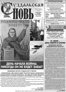 Газета основана 21 марта 1918 г. № 45 (12618) пятница, 20 июня 2025 г. Общественно политическая газета 12+ • ДОМА, БАНИ, ТЕРРАСЫ, КРОЕМ КРЫШИ и т.д. • Отмостка, фундамент, замена полов и венцов • Подъем просевших домов, обшивка сайдингом • Внешняя и внутренняя отделка и многое другое. Пенсионерам скидка от 5 до 15% Выезд на осмотр БЕСПЛАТНО Тел. 8 920 944 30 30, Александр. * Информацию об условиях и организаторе скидок узнавайте по телефону. Реклама. СТРОИТЕЛЬНАЯ БРИГАДА Выполняет строительные работы любой сложности из своего материала либо материала заказчика: Ранним утром 22 июня 1941 года фашистская Германия вероломно напала на Советский Союз, развязав самую кровопролитную и бесчеловечную войну. Она унесла 27 миллионов жизней, оставив незаживающие раны в каждой семье. Наш народ плечом к плечу встал на борьбу с агрессором. Мы помним о подвиге защитников Брестской крепости, о героической обороне Москвы и Сталинграда, о самоотверженной борьбе партизан. В каждом городе и селе, на каждом рубеже советские воины стояли насмерть, защищая свою Родину, её свободу и независимость. С первых дней Великой Отечественной войны Владимирская земля стала важной частью тыла, где ковалась одна на всех Победа. Рабочие заводов, фабрик, колхозники и крестьяне самоотверженно трудились, чтобы обеспечить армию всем необходимым. В регионе было развёрнуто производство оружия, боеприпасов и другой продукции. За четыре года на фронт ушли около 300 тысяч владимирцев, почти половина из них не вернулась домой. Более 240 жителей удостоены звания Героя Советского Союза. Память о героях-земляках живет в названиях улиц и скверов, в мемориалах и обелисках. В этом году в областной столице будет открыта стела «Владимир – город трудовой доблести». Передать правду о Великой Отечественной молодым поколениям – святой долг перед ветеранами. Наши дети должны знать, что фашизм – зло, которое необходимо искоренять. Поэтому мы обязаны противостоять любым попыткам переписать историю, предать забвению злодеяния нацистов и их пособников в Бабьем Яру, Освенциме, Бухенвальде, другие преступления против человечности. Однако киевский режим при поддержке западных стран систематически уничтожал нашу общую память, попирал права русскоязычных граждан, героизировал нацистских преступников. Эта политика – прямое продолжение идеологии фашизма. Именно против неё сейчас сражаются участники специальной военной операции. Гордимся и поддерживаем наших военнослужащих. Они – достойные наследники победителей. Нет никаких сомнений, что и в этот раз Победа будет за нами, что справедливость восторжествует, а мир и стабильность вернутся на землю Донбасса. А.А. АВДЕЕВ, Губернатор области. УВАЖАЕМЫЕ ЖИТЕЛИ ВЛАДИМИРСКОЙ ОБЛАСТИ! 22 ИЮНЯ – ДЕНЬ ПАМЯТИ И СКОРБИ ЕДИНЫЙ ДЕНЬ ПРИЕМА МОЛОДЕЖИ Прием будет вести: 26 июня с 9.00 до 10.00 – Екатерина Владимировна Маркина, начальник управления образования и молодежной политики. 26 июня с 10.00 до 11.00 – Надежда Алексеевна Коновалова, руководитель ГКУ ВО «Центр занятости населения город Суздаль». Предварительная запись по телефону 8(49231) 2-16-43. УВАЖАЕМЫЕ ЖИТЕЛИ СУЗДАЛЬСКОГО РАЙОНА! 22 июня в России – День памяти и скорби. Это трагическая дата, напоминающая о начале Великой Отечественной войны в 1941 году. Самая кровопролитная и разрушительная в истории человечества, она ворвалась в жизнь м